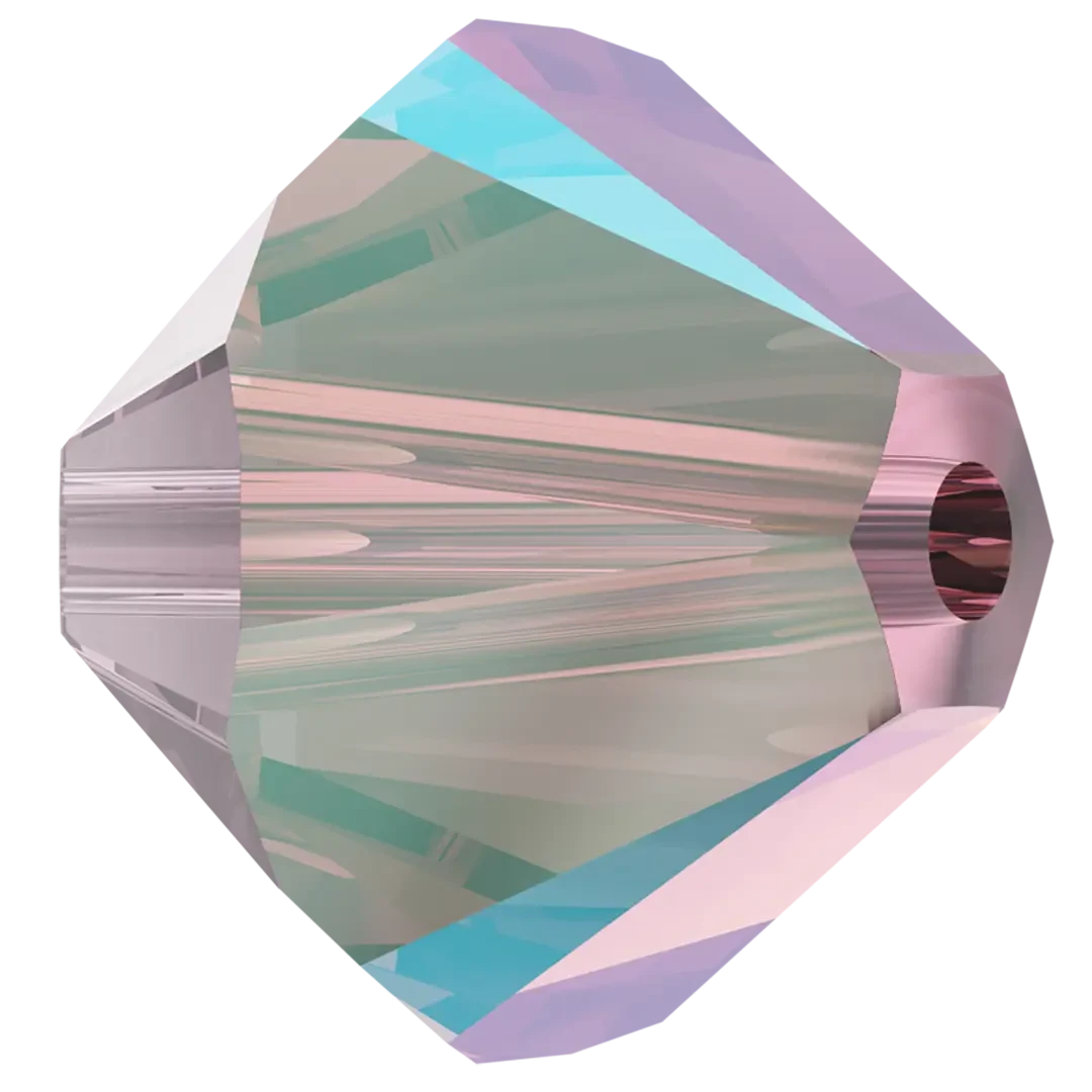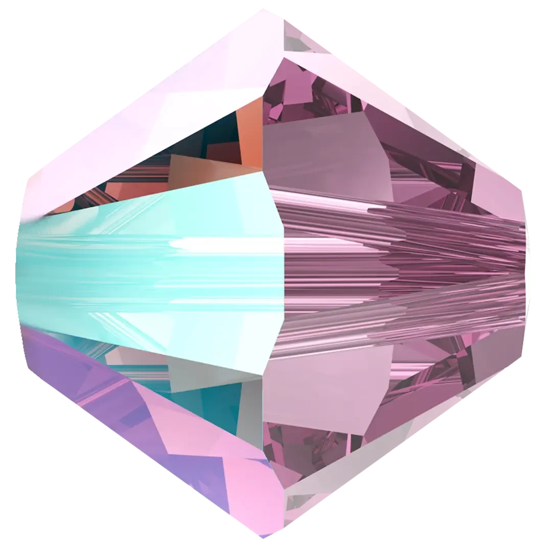 (5328) in Light Amethyst Shimmer have a smooth thread hole and are multi-faceted to reflect the light, making them perfect to create bespoke designs. Swarovski Bicone
