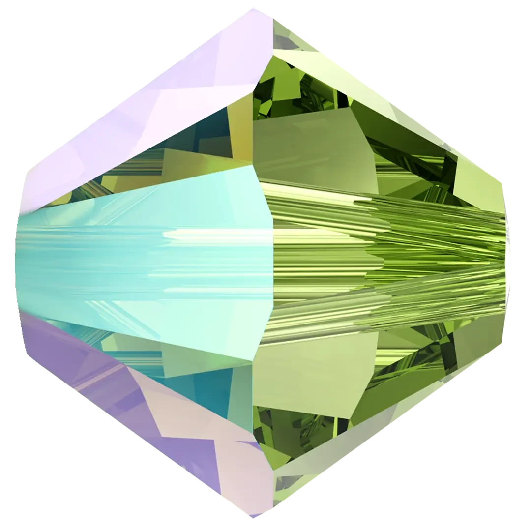 (5328) in Peridot Shimmer have a smooth thread hole and are multi-faceted to reflect the light, making them perfect to create bespoke designs. Swarovski Bicone