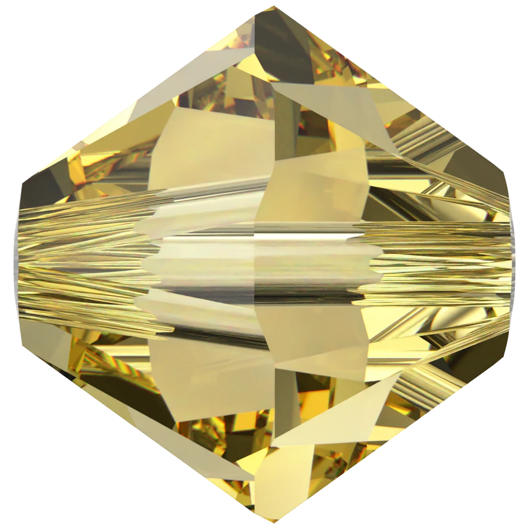 Swarovski crystal beads Xilion Bicone (5328) in Recreated Dark Jonquil have a smooth thread hole and are multi-faceted to reflect the light, making them perfect to create bespoke designs. Swarovski Bicone beads are cylindrical in shape and taper at both ends to form a bi-conical shape. The tapered multi-faceted shape of bicone beads adds texture, dimension and sparkle to jewellery and bespoke designs.