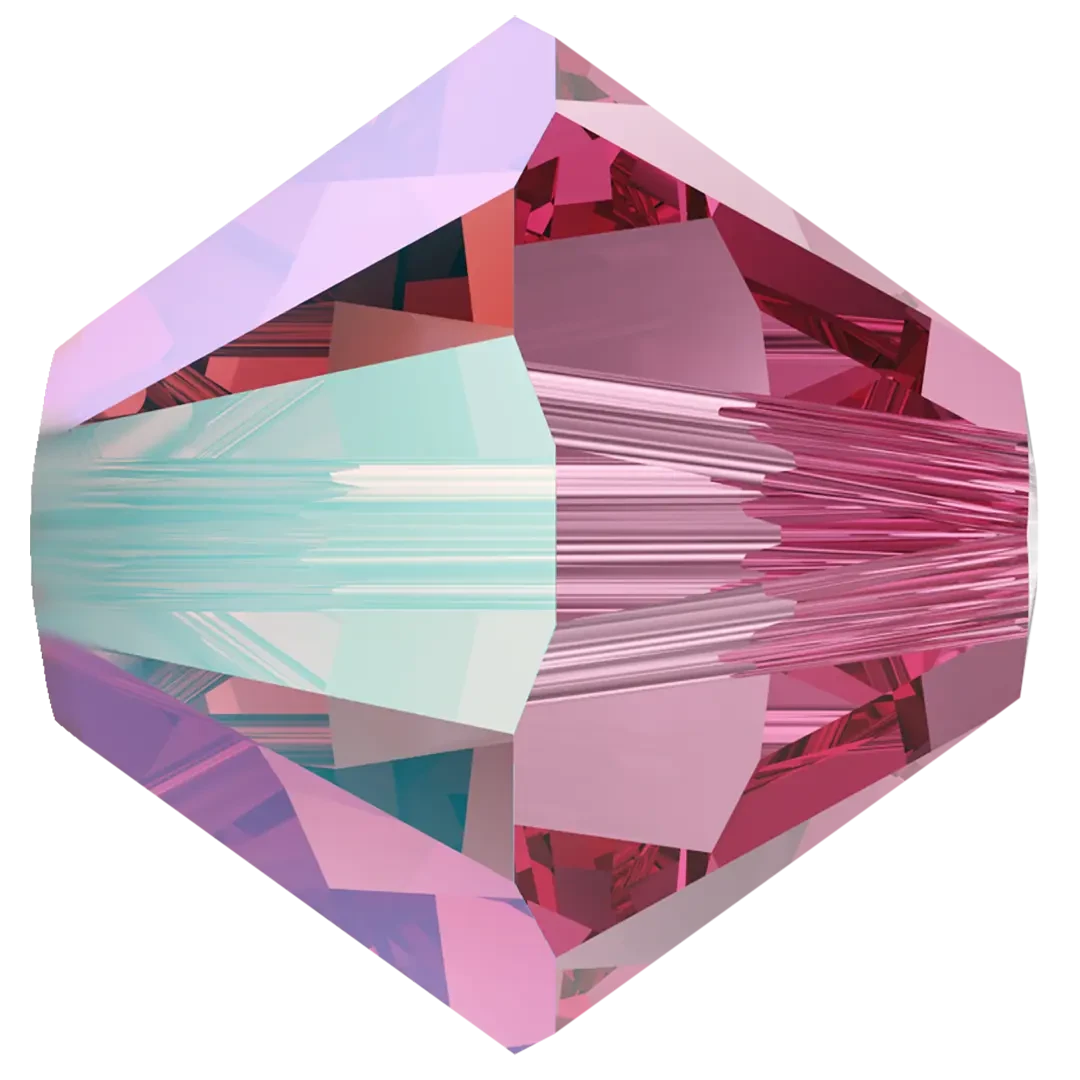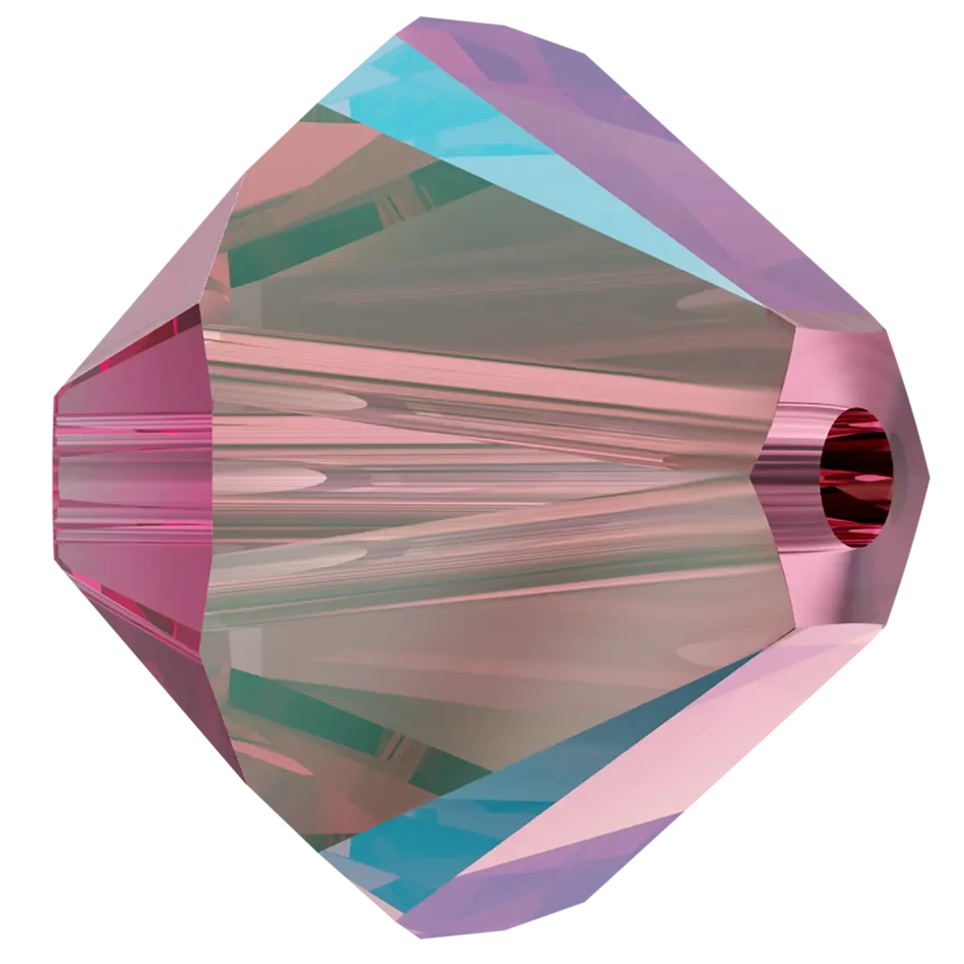 Swarovski crystal beads Xilion Bicone (5328) in Rose Shimmer have a smooth thread hole and are multi-faceted to reflect the light, making them perfect to create bespoke designs. Swarovski Bicone beads are cylindrical in shape and taper at both ends to form a bi-conical shape. The tapered multi-faceted shape of bicone beads adds texture, dimension and sparkle to jewellery and bespoke designs.