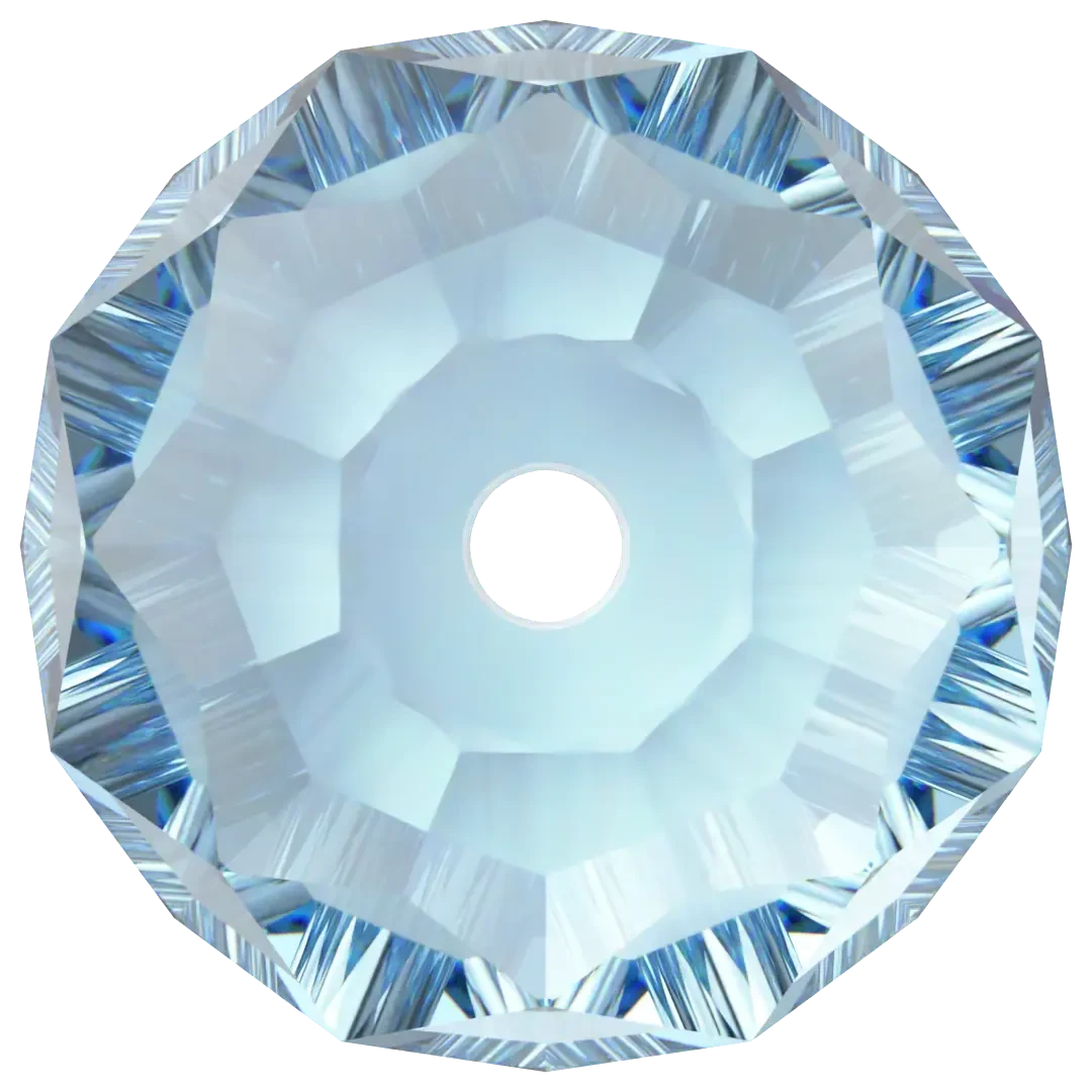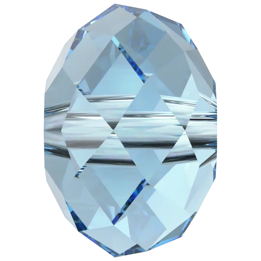 Swarovski crystal beads Briolette (5040) in Aquamarine have a smooth thread hole and are multi-faceted to reflect the light, making them perfect to create bespoke designs. Swarovski Briolette shaped beads are shaped like a doughnut, with a round, flat shape and a hole in the center. Their design makes them a versatile choice for a variety of jewellery making projects. They can be strung together to create simple yet elegant necklaces and bracelets, or used as accents in more complex designs. Briolette beads also pair well with other Swarovski crystal beads and components, allowing designers to create unique and cohesive pieces.
