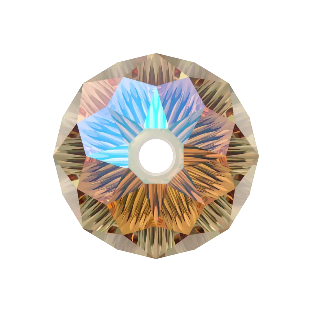 Light Colorado Topaz Shimmer 2X is a soft and warm golden brown colour, often with a hint of orange or peach undertones. It is a lighter version of the deeper, more saturated Colorado Topaz colour. This colour can convey a sense of warmth, comfort, and approachability and also evoke a feeling of natural beauty, as it resembles the warm hues of autumn leaves and sun-kissed earth. The shimmer coating gives the colour a milder variant of the Aurora Borealis (AB) effect, providing a more subdued glittery appearance. The 2X after Light Colorado Topaz Shimmer indicates that the coating is on both sides of the crystal.