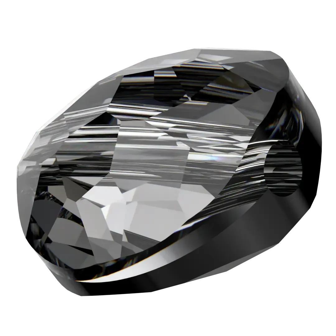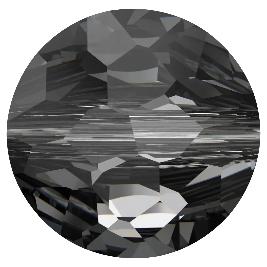 Swarovski crystal beads Fantasy Round (5034) in Crystal Silver Night features a round shape with a unique, irregular faceting pattern that creates a mesmerizing play of light and colour. The facets are arranged in a way that creates a kaleidoscopic effect, with different colours and shapes visible from different angles.