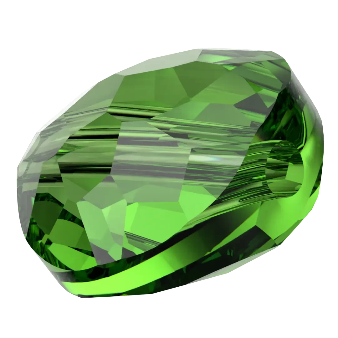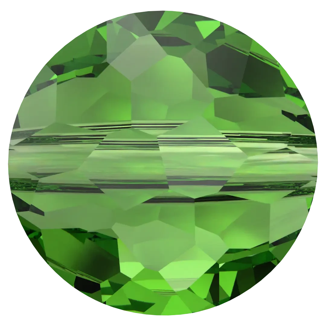 Swarovski crystal beads Fantasy Round (5034) in Fern Green features a round shape with a unique, irregular faceting pattern that creates a mesmerizing play of light and colour. The facets are arranged in a way that creates a kaleidoscopic effect, with different colours and shapes visible from different angles.