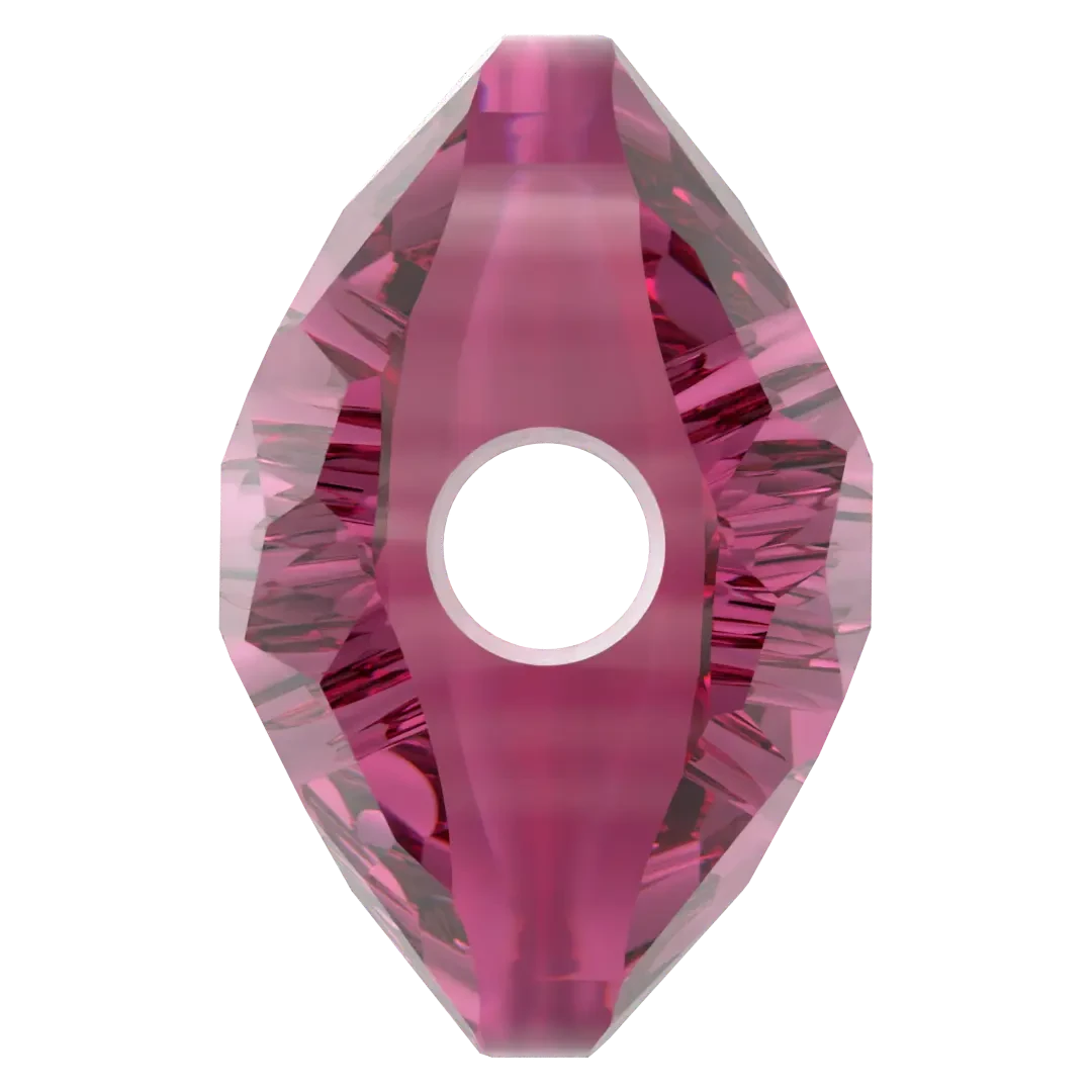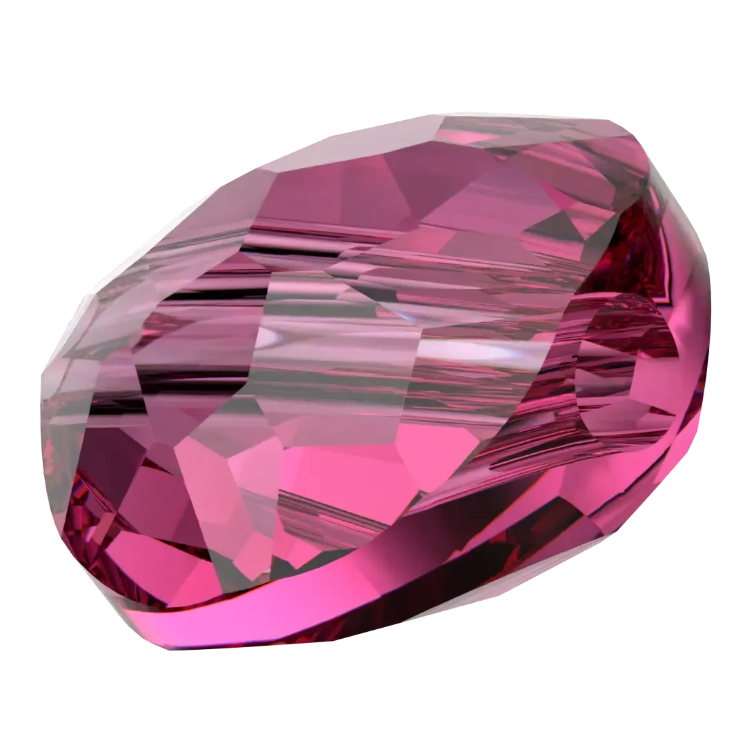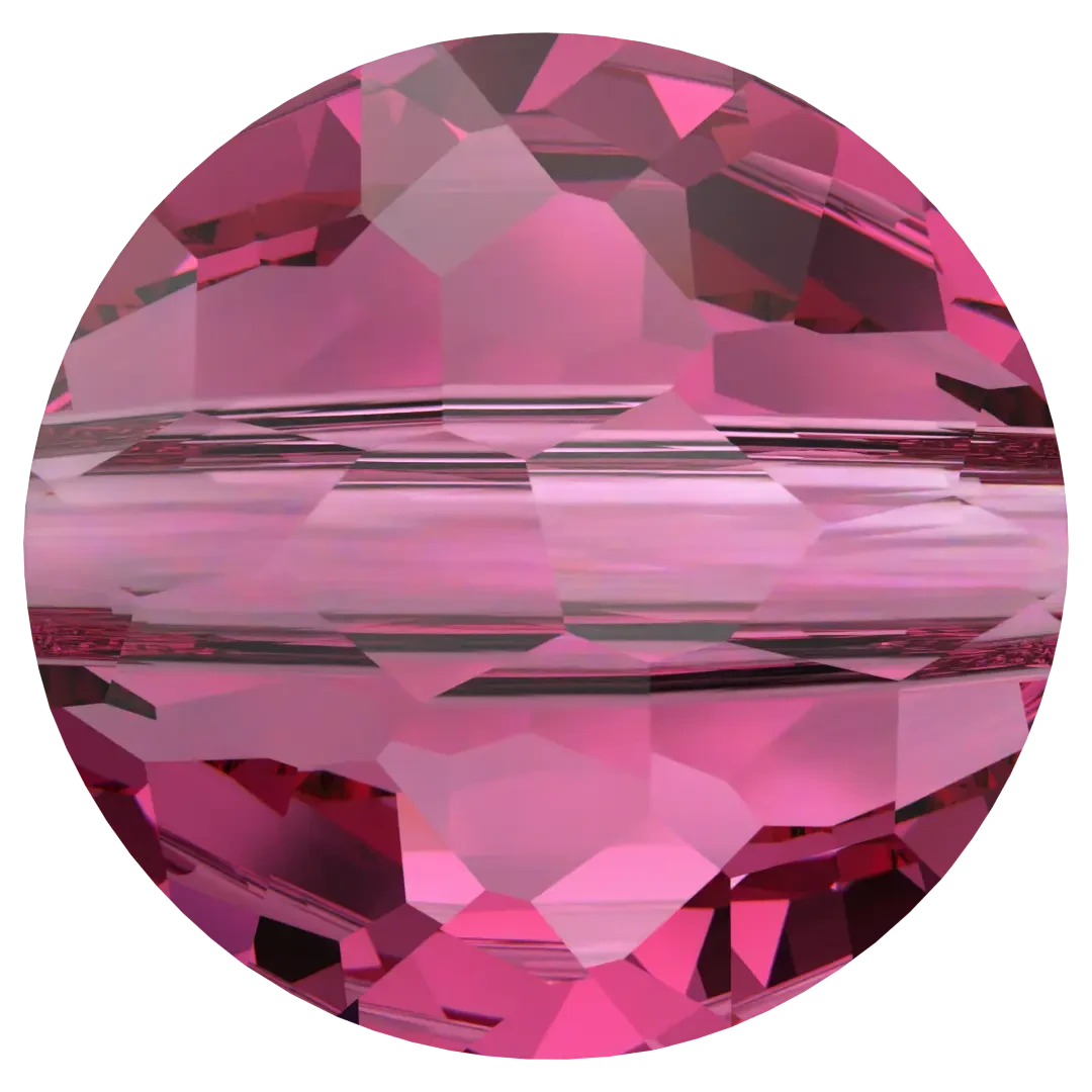 Swarovski crystal beads Fantasy Round (5034) in Fuchsia features a round shape with a unique, irregular faceting pattern that creates a mesmerizing play of light and colour. The facets are arranged in a way that creates a kaleidoscopic effect, with different colours and shapes visible from different angles.