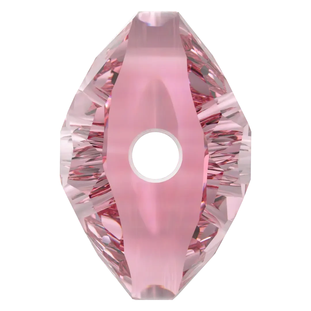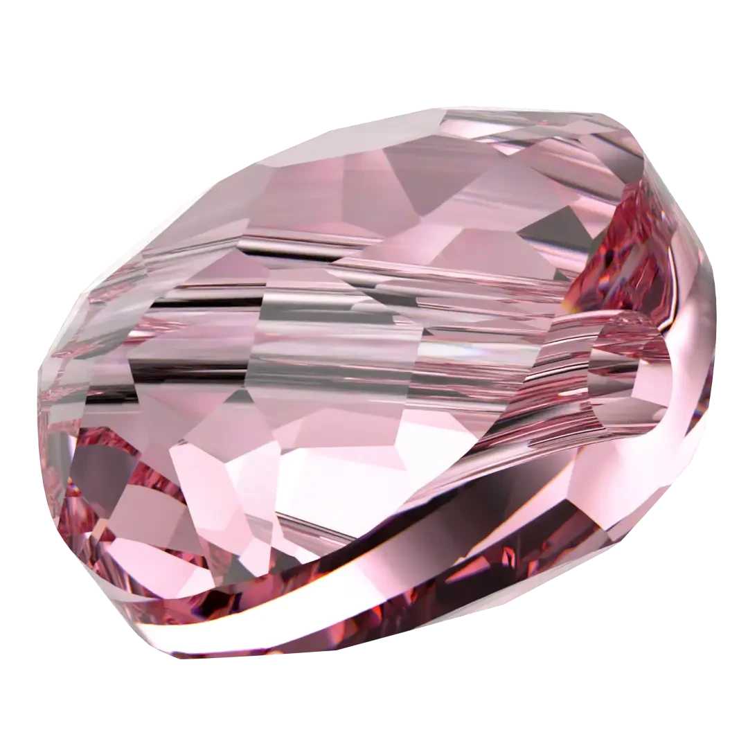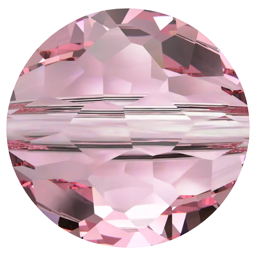 Swarovski crystal beads Fantasy Round (5034) in Light Rose features a round shape with a unique, irregular faceting pattern that creates a mesmerizing play of light and colour. The facets are arranged in a way that creates a kaleidoscopic effect, with different colours and shapes visible from different angles.