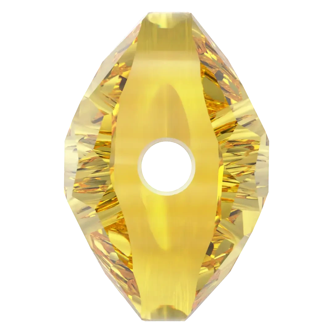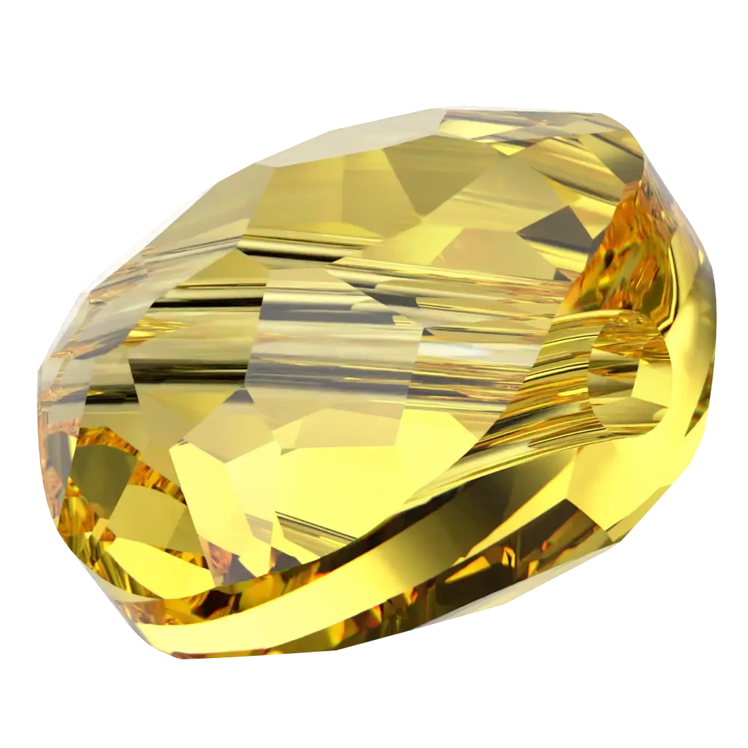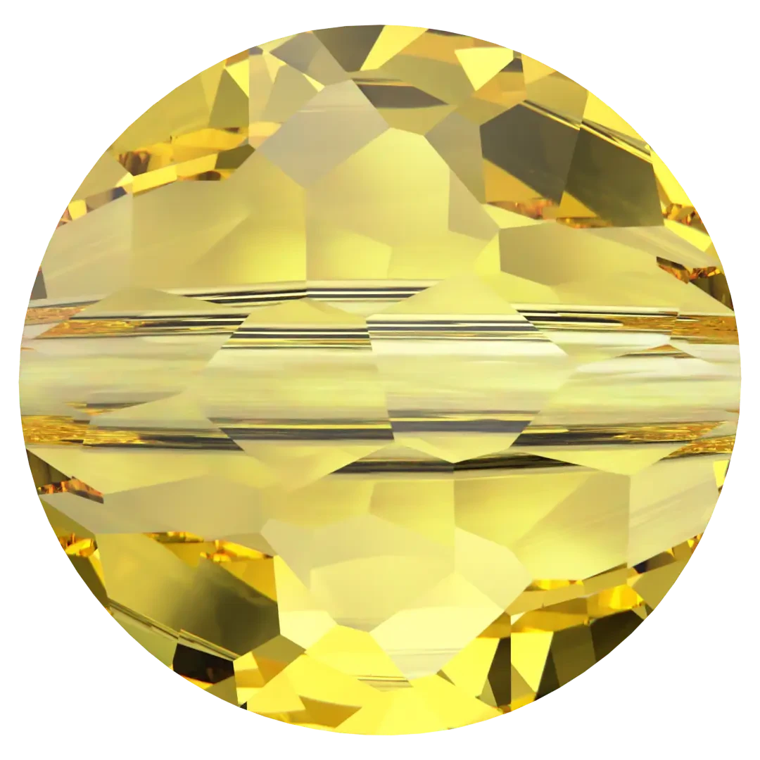 Swarovski crystal beads Fantasy Round (5034) in Light Topaz features a round shape with a unique, irregular faceting pattern that creates a mesmerizing play of light and colour. The facets are arranged in a way that creates a kaleidoscopic effect, with different colours and shapes visible from different angles.