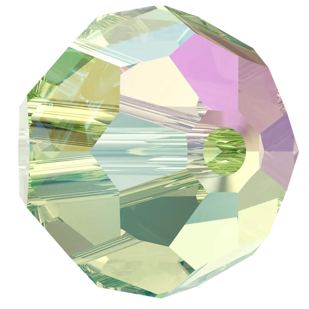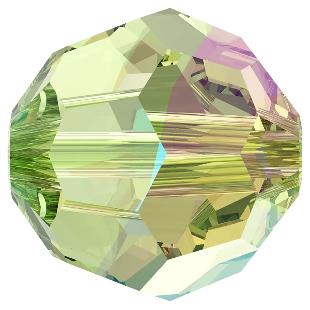 Swarovski crystal beads Round (5000) in Peridot Shimmer have a smooth thread hole and are multi-faceted to reflect the light, making them perfect to create bespoke designs. These Round beads are shaped into a uniform sphere and are highly sought after for their versatility, wide range of sizes, and availability in an extensive colour palette. The many facets of round beads create a sparkling effect that reflects light from various angles, making them ideal for adding shine and dimension to jewellery and embellishment projects.