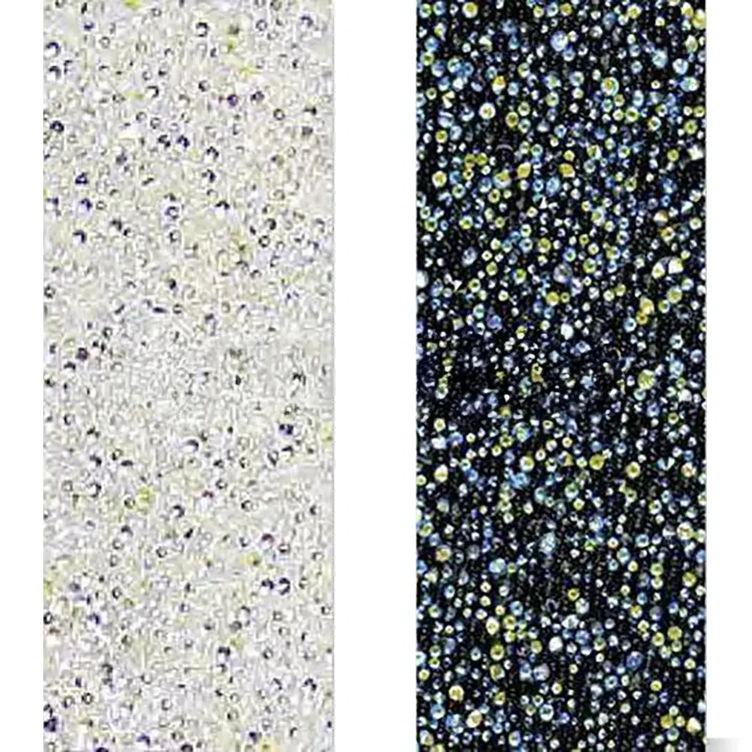 Crystal Fabric Bandings consists of a carrier material that is completely covered with millions of tiny cut and uncut crystals. Depending on the colour and surface of the carrier material, Crystal Fabric with transparent film changes its look dramatically. Crystal Fabric on a black film creates a deep, mysteriously soft gleam, dressed up with a very alluring sparkle.