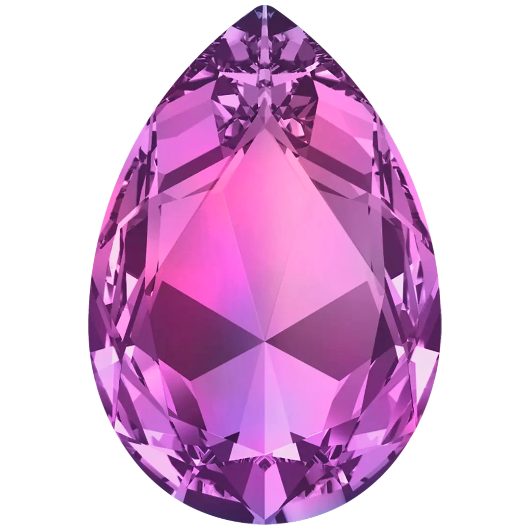 Swarovski fancy stones Large Pear (4327) in Amethyst are multi faceted pointed back crystals that have no thread hole and can be applied to fabric or to create jewellery designs using metal settings or in pre-made cavities. Swarovski Large Pear shaped crystals are traditional pear in shape with a rounded bottom and a pointed top. They have a symmetrical shape with a faceted surface that creates a brilliant shine and sparkle.