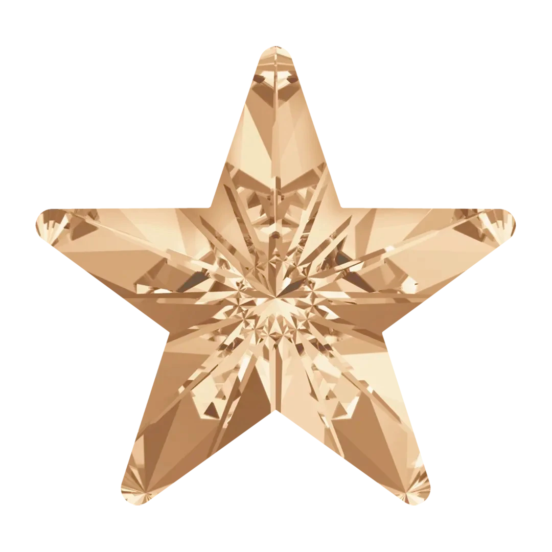 Swarovski fancy stones Star (4745) in Crystal Golden Shadow are multi faceted pointed back crystals that have no thread hole and can be applied to fabric or to create jewellery designs using metal settings or in pre-made cavities. Swarovski Star shaped crystals are designed to mimic the brilliance and radiance of stars. These crystals have a central point and multiple facets extending outwards in a symmetrical pattern, which creates a dazzling star-like effect. The faceting is precision-cut to maximize the reflection and refraction of light, resulting in a shimmering and glittering appearance.