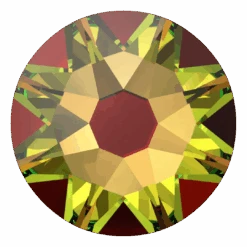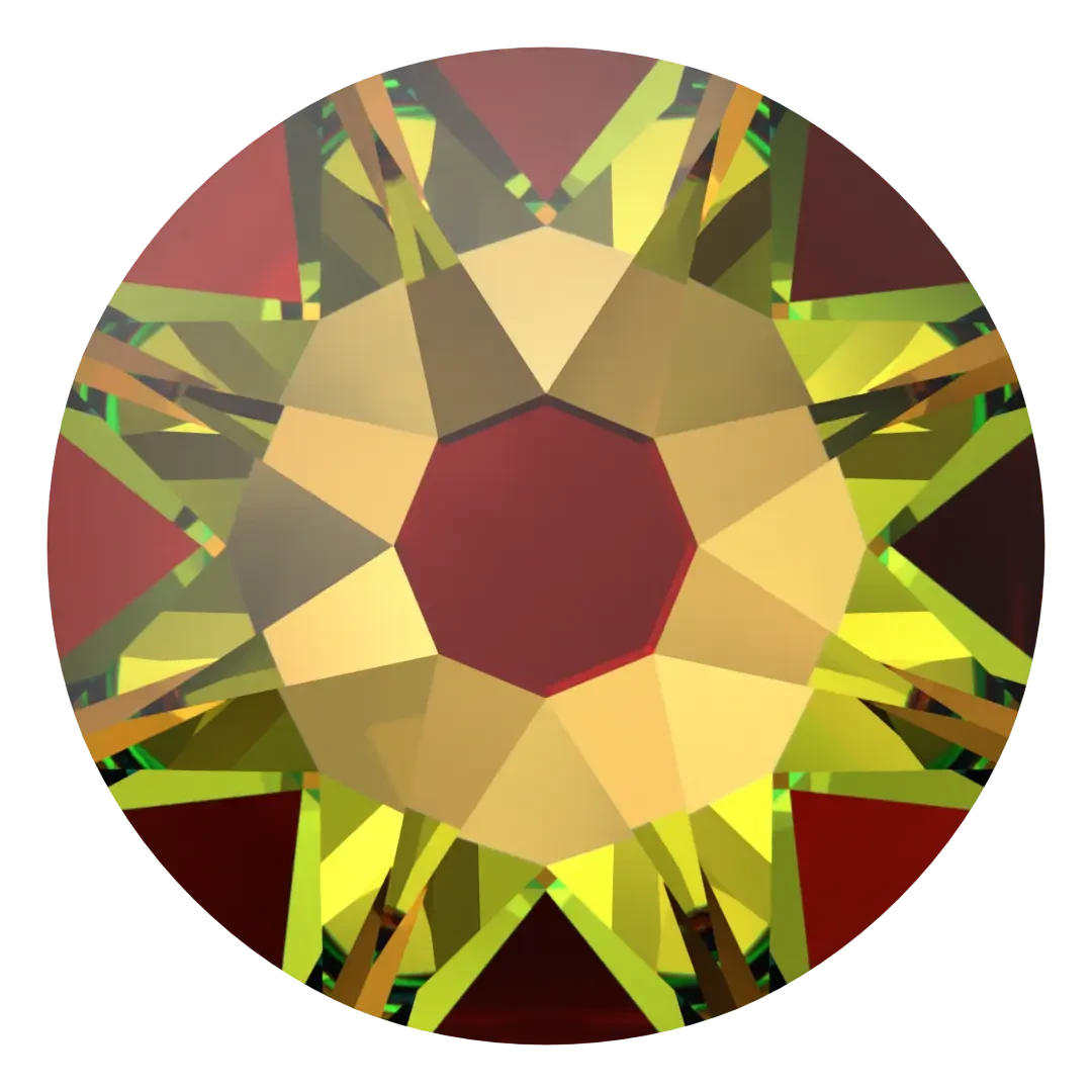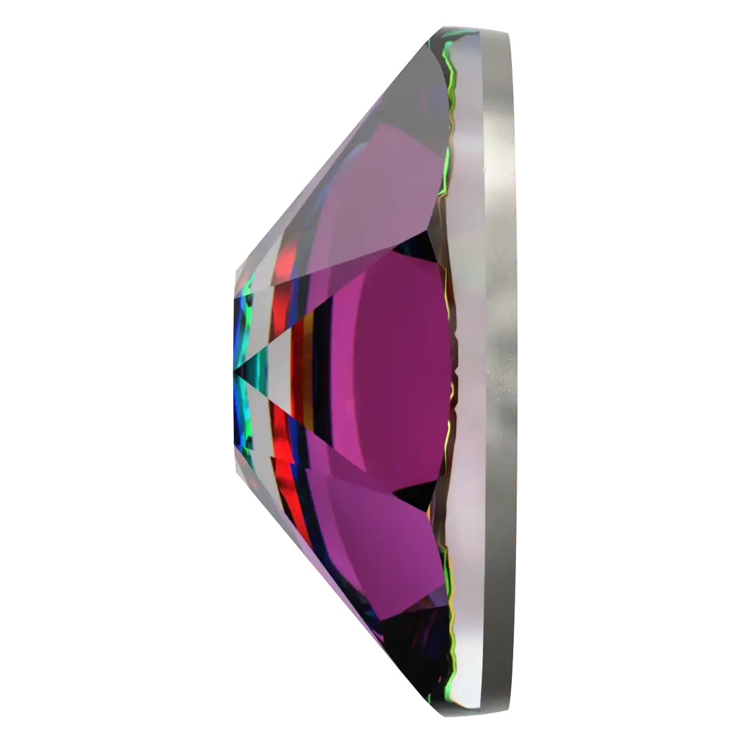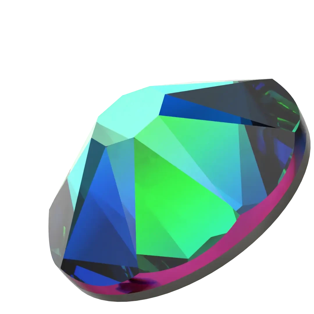 Swarovski rhinestones non hotfix Round (2000 Rose, 2058 Xilion & 2088 Xirius) in Crystal Vitrail Medium are flat back crystals that can easily be applied to most surfaces with glue. Crystal Vitrail Medium is a deep and vibrant green colour with reflective rays of fuchsia, purple, orange, and yellow. This combination of colours creates a kaleidoscope effect that changes with the light and viewing angle. When light hits the surface of the crystal, it reflects and refracts off the different colours, creating a mesmerizing and dynamic visual display.