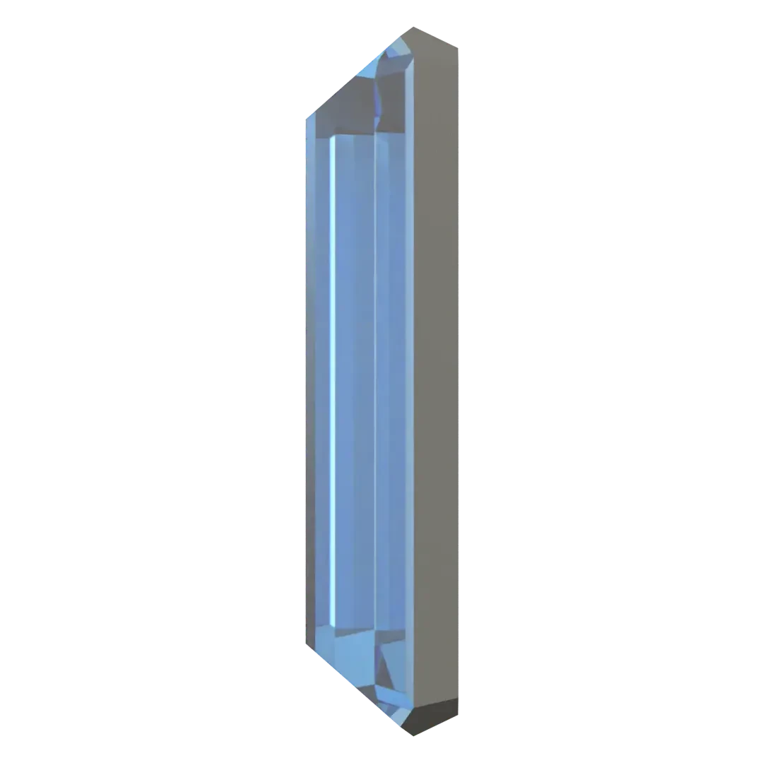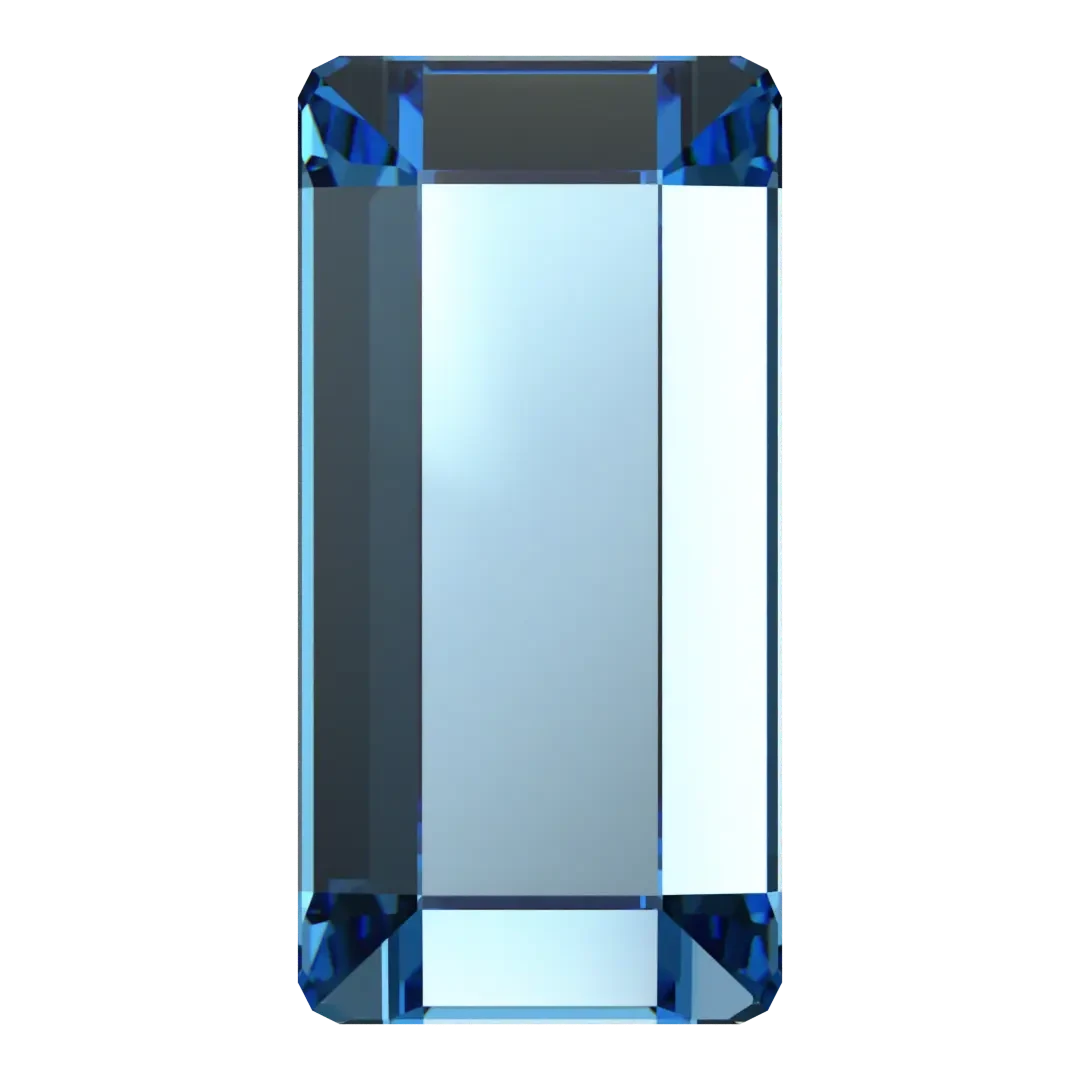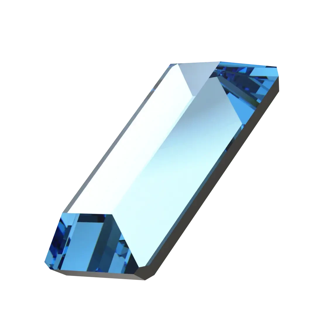 Swarovski rhinestones non hotfix Baguette (2510) in Aquamarine are flat back crystals that can easily be applied to most surfaces with glue. Swarovski Baguette shaped flat backs have a long and slender shape that resembles a French bread baguette . They are often used in costume design and are typically cut with straight sides and pointed ends to enhance their elongated shape.