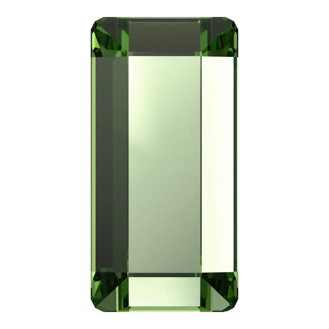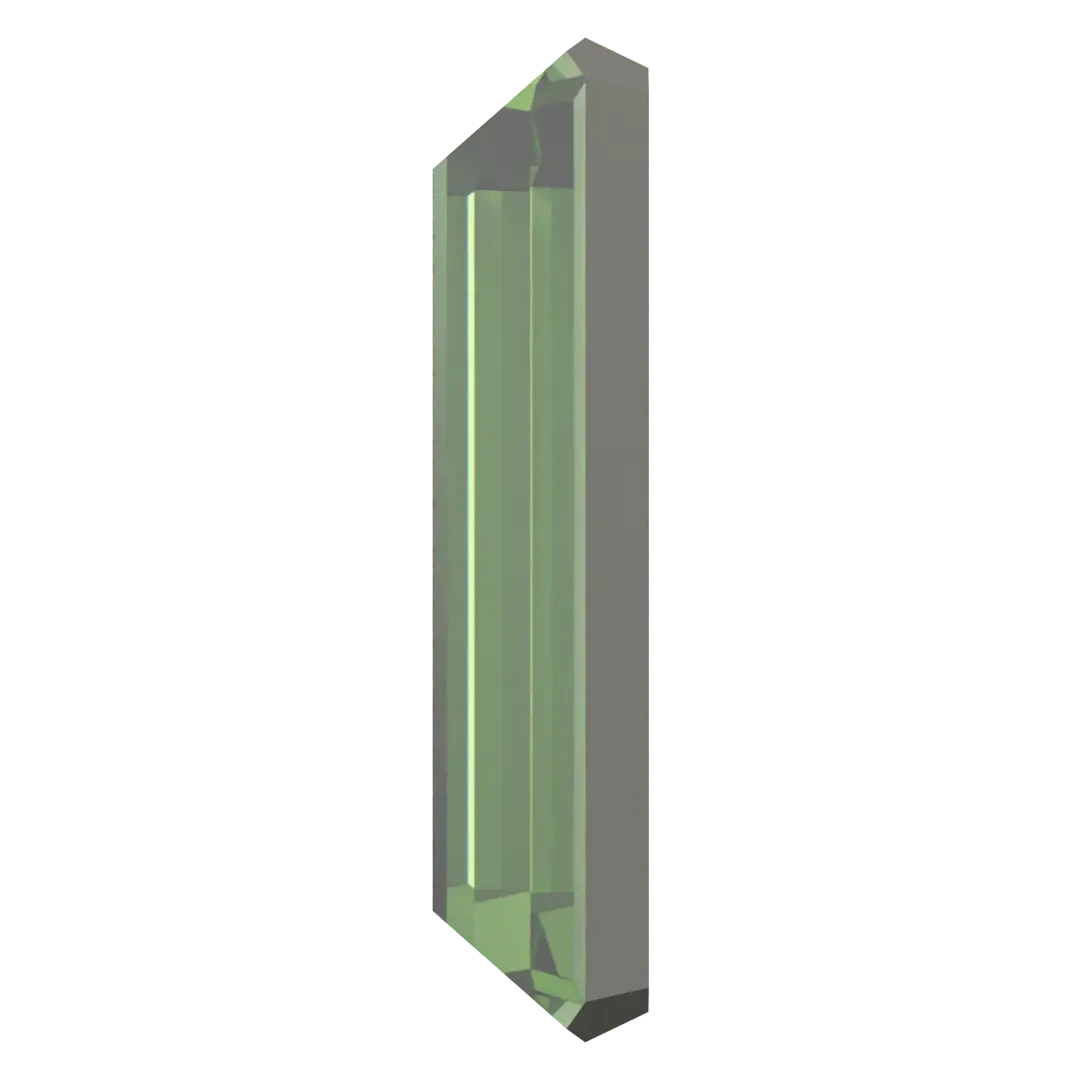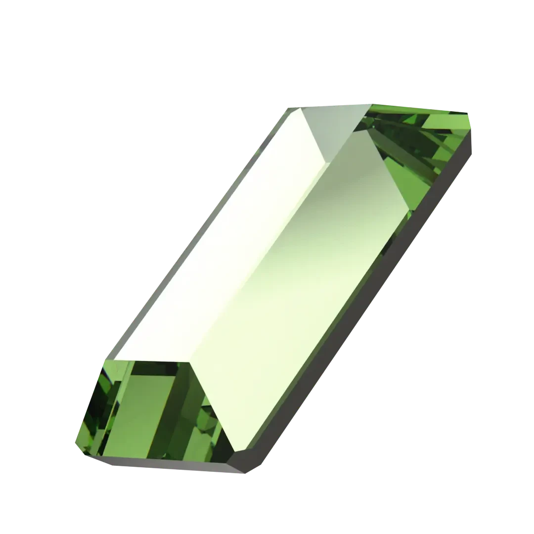 Swarovski rhinestones non hotfix Baguette (2510) in Recreated Peridot are flat back crystals that can easily be applied to most surfaces with glue. Swarovski Baguette shaped flat backs have a long and slender shape that resembles a French bread baguette . They are often used in costume design and are typically cut with straight sides and pointed ends to enhance their elongated shape.