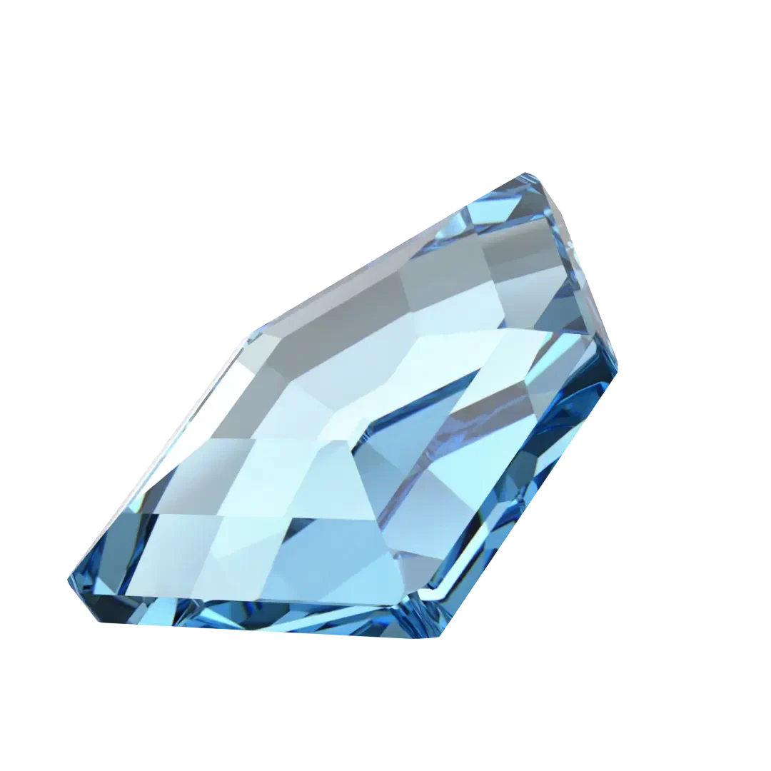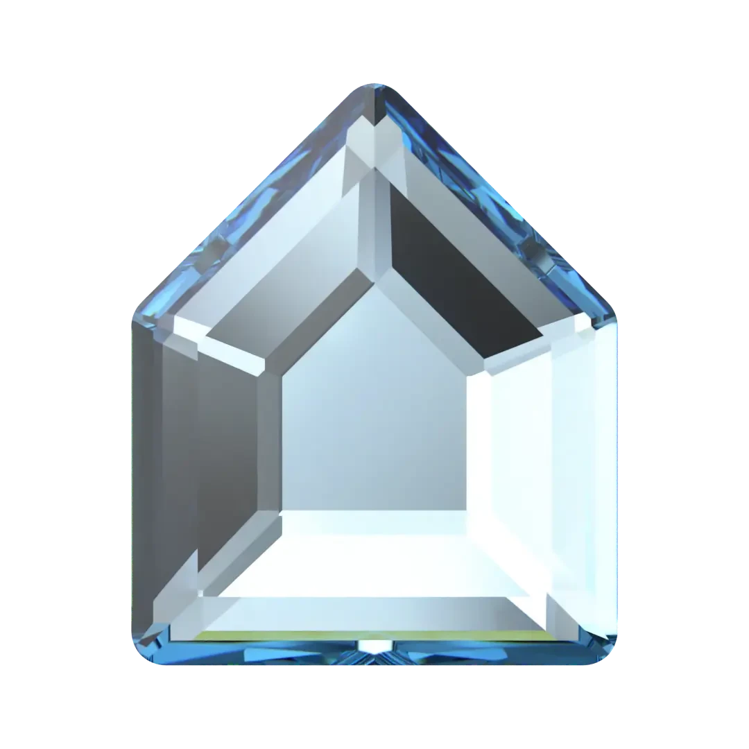 Swarovski rhinestones non hotfix Concise Pentagon (2775) in Aquamarine are flat back crystals that can easily be applied to most surfaces with glue. Swarovski Concise Pentagon shaped crystals have a five-sided polygon shape with flat sides. The edges of the pentagon are straight, and the surface of the crystal is intricately cut with a series of small facets arranged in a geometric pattern.