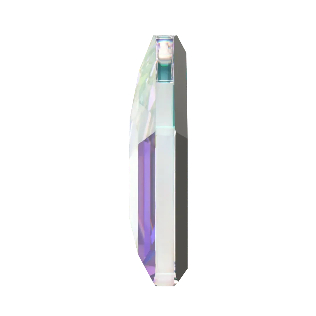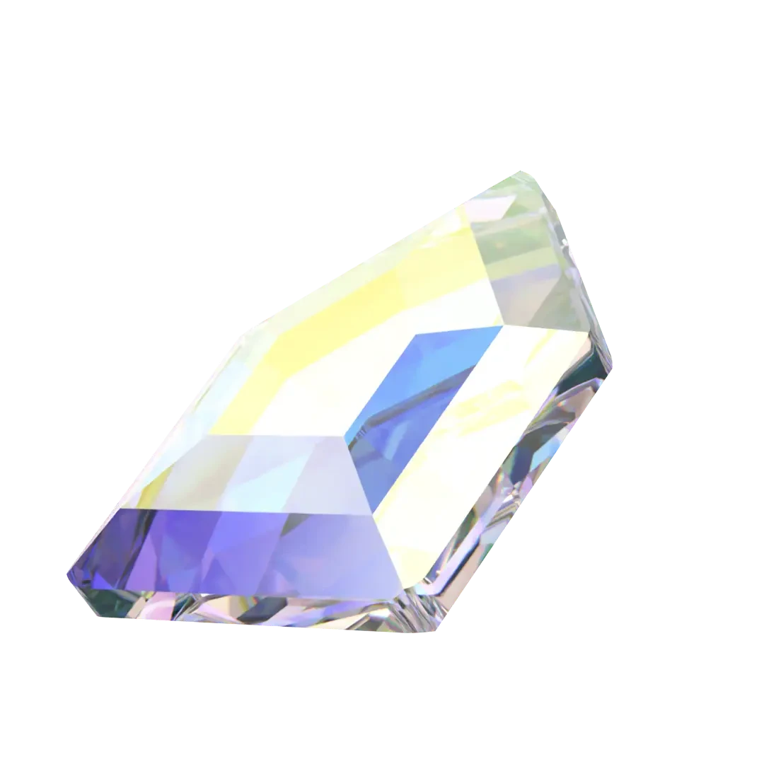 Swarovski rhinestones non hotfix Concise Pentagon (2775) in Crystal AB are flat back crystals that can easily be applied to most surfaces with glue. Swarovski Concise Pentagon shaped crystals have a five-sided polygon shape with flat sides. The edges of the pentagon are straight, and the surface of the crystal is intricately cut with a series of small facets arranged in a geometric pattern.