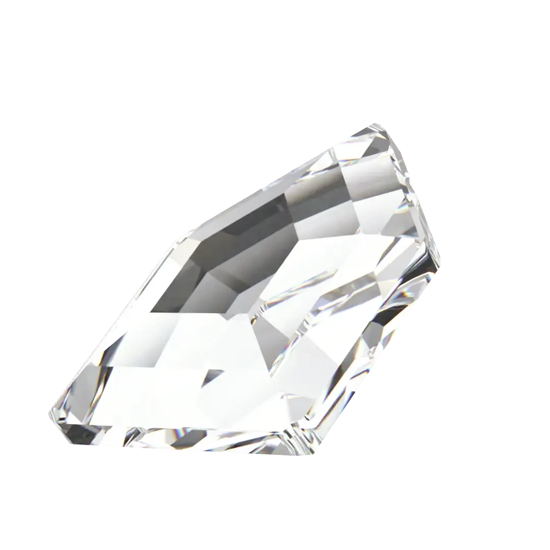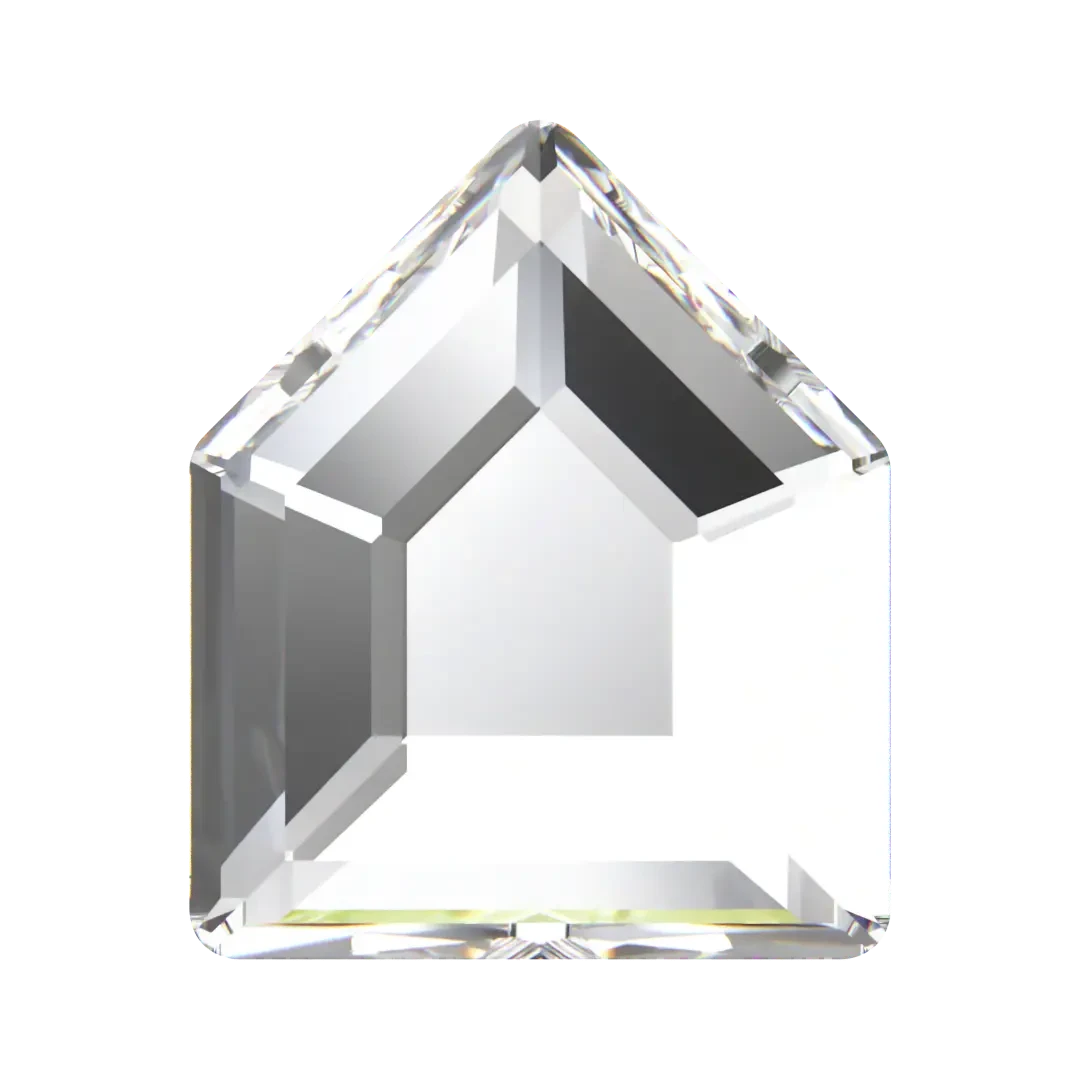 Swarovski rhinestones non hotfix Concise Pentagon (2775) in Crystal are flat back crystals that can easily be applied to most surfaces with glue. Swarovski Concise Pentagon shaped crystals have a five-sided polygon shape with flat sides. The edges of the pentagon are straight, and the surface of the crystal is intricately cut with a series of small facets arranged in a geometric pattern.
