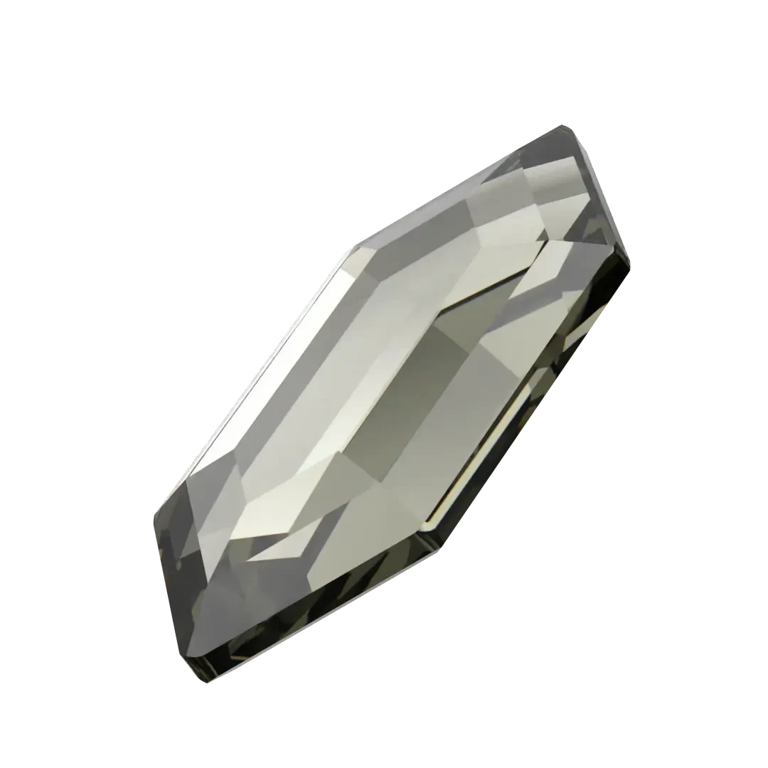 Swarovski rhinestones non hotfix Elongated Hexagon (2776) in Black Diamond are flat back crystals that can easily be applied to most surfaces with glue. Swarovski Elongated Hexagon shaped features a unique hexagonal shape. Unlike a regular hexagon, this crystal has elongated sides, giving it a more slender and elongated appearance. The crystal has a flat top surface and bevelled edges that catch the light and create a dazzling effect.