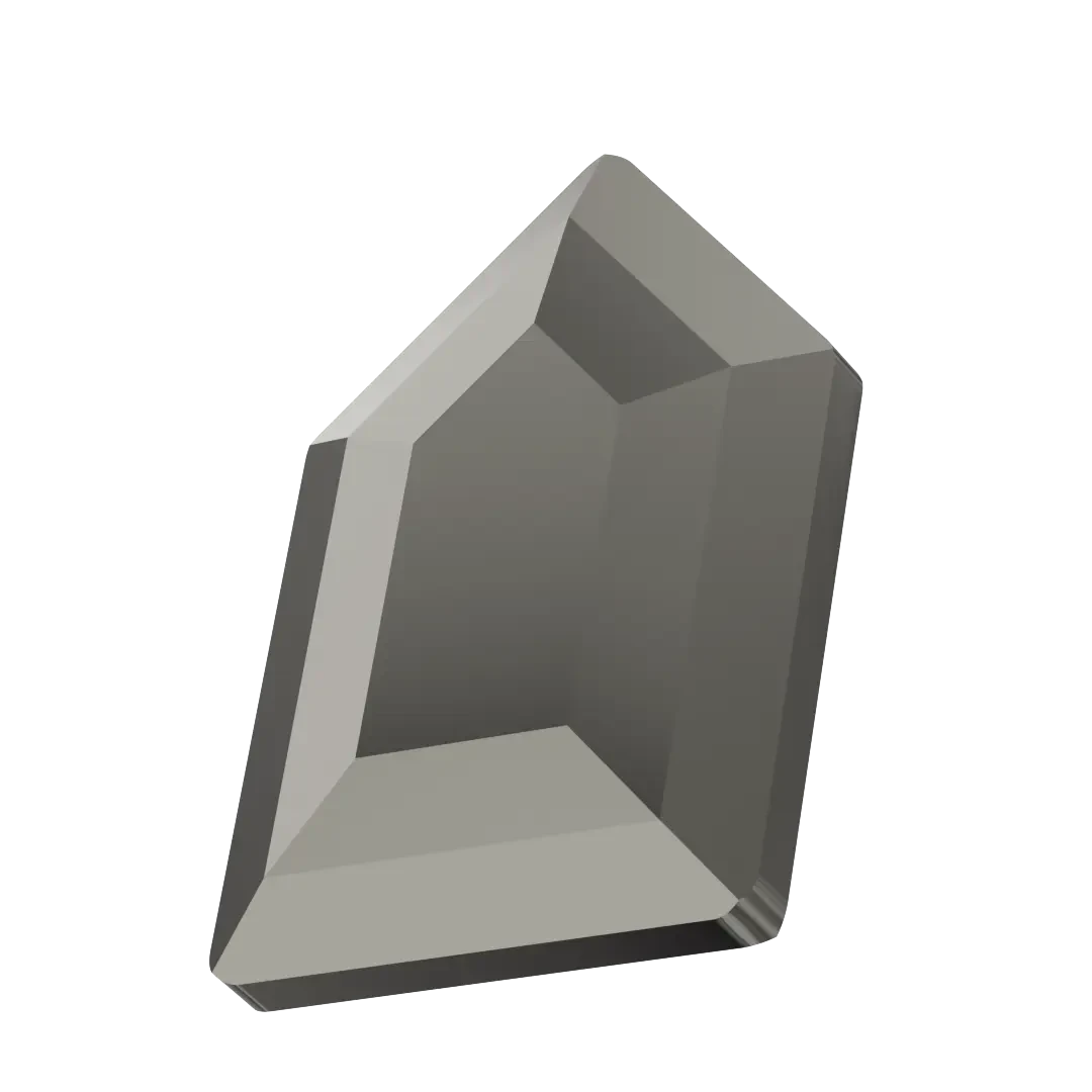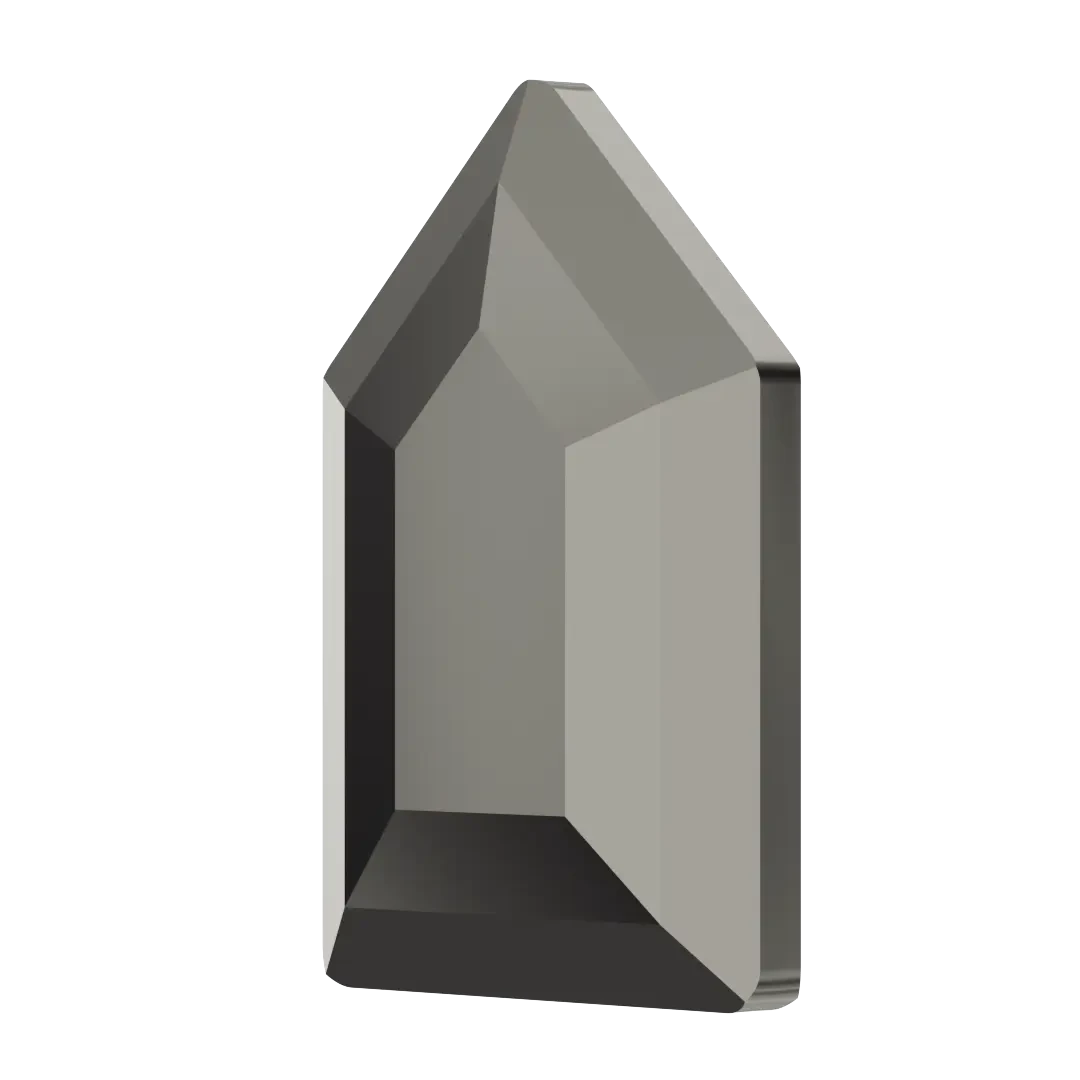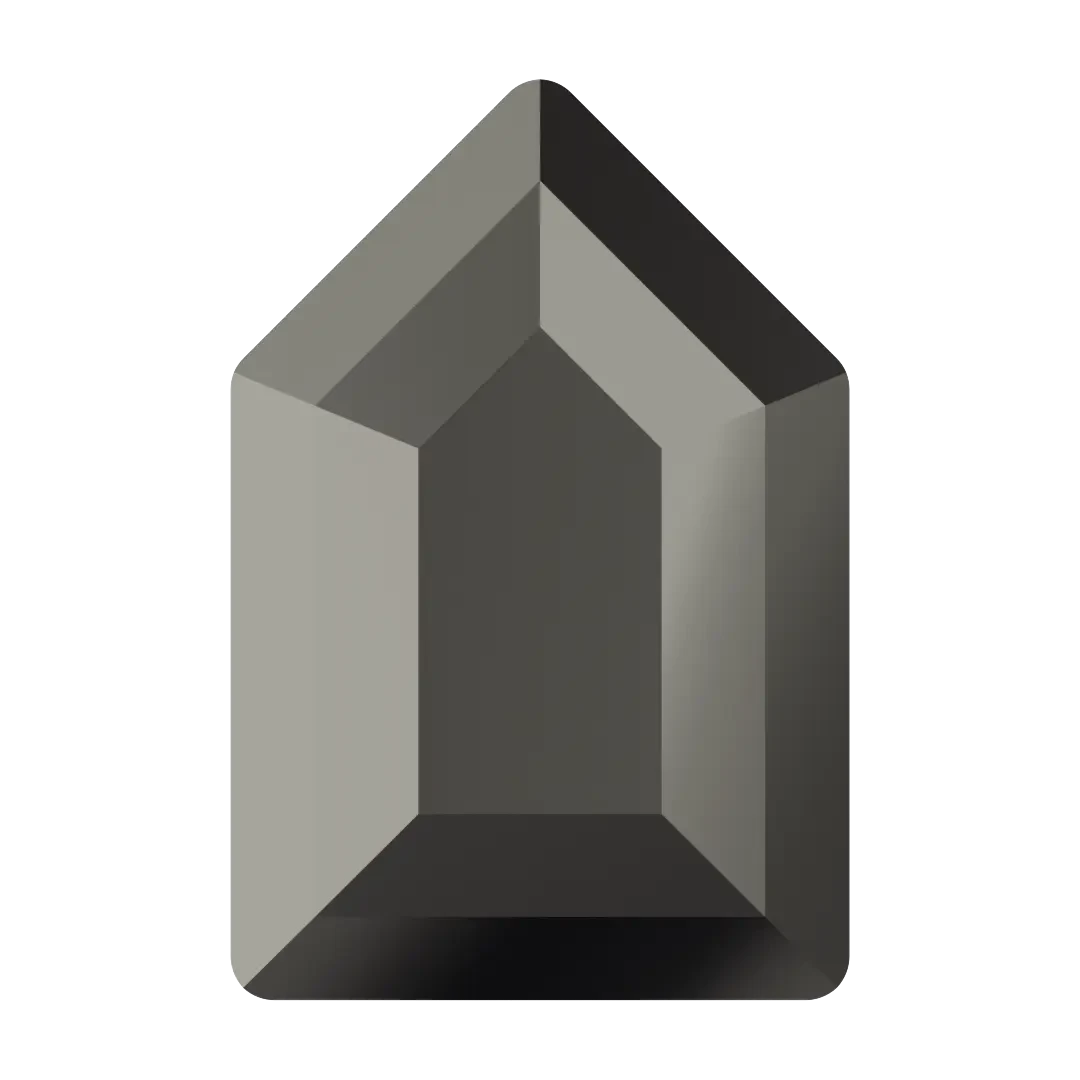 Swarovski rhinestones non hotfix Elongated Pentagon (2774) in Jet Hematite UNFOILED are flat back crystals that can easily be applied to most surfaces with glue. Swarovski Elongated Pentagon shaped crystals are a pentagonal shape with elongated sides. The elongated shape of the crystal gives it a more sleek appearance compared to a regular pentagon. The crystal has a flat top surface and bevelled edges, with five straight sides where two sides meet to a point.