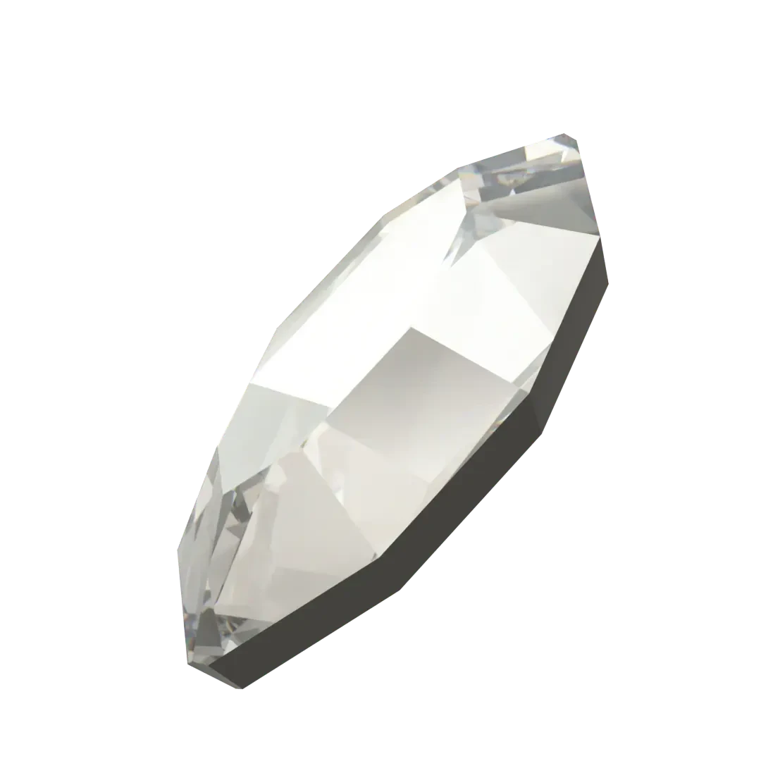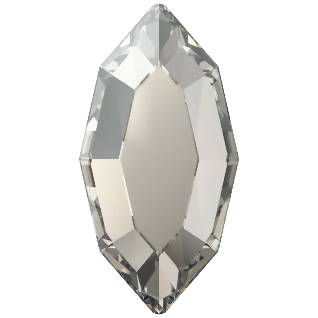 Swarovski rhinestones non hotfix Navette (2200) in Crystal Silver Shade are flat back crystals that can easily be applied to most surfaces with glue. Swarovski Navette shaped crystals have an elongated, oval shape with pointed ends that resemble a small canoe or a leaf. They have a flat top surface and bevelled edges that create a multi-faceted effect, giving them a sparkling and radiant appearance.