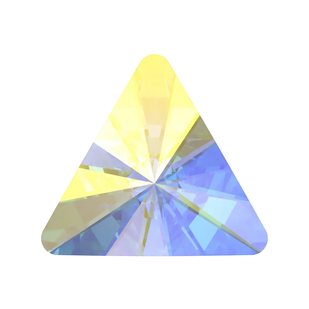 Swarovski rhinestones non hotfix Rivoli Triangle (2716) in Crystal AB are flat back crystals that can easily be applied to most surfaces with glue. Swarovski Rivoli Triangle shaped crystals have unique shape that combines the classic round rivoli shape with a triangle shape. The Swarovski Rivoli Triangle has a circular base with triangular facets on top, giving it a three-dimensional appearance.