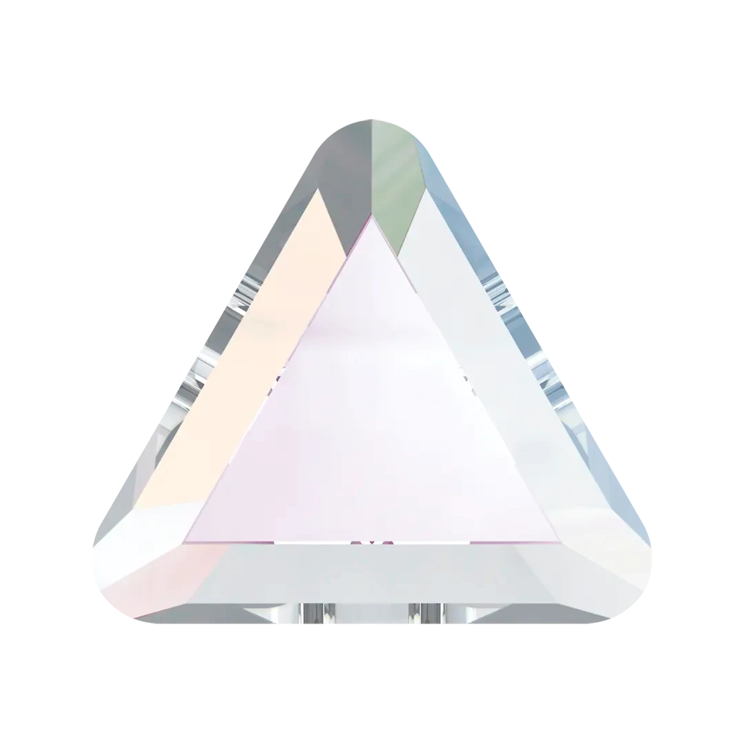 Swarovski rhinestones non hotfix Triangle (2711) in Crystal AB are flat back crystals that can easily be applied to most surfaces with glue. Swarovski Triangle shaped crystals are geometric in shape and feature three equal sides that come together to form a perfect triangle. The shape has a flat top and simple bevelled sides, making it a popular choice for embellishment.