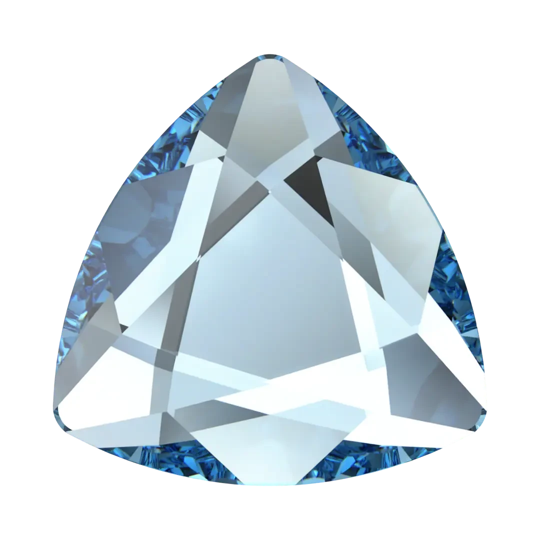 Swarovski rhinestones non hotfix Trilliant (2472) in Aquamarine are flat back crystals that can easily be applied to most surfaces with glue. Swarovski Trilliant shaped crystals are cut into a triangular shape with rounded edges and are known for their striking brilliance and unique faceting. The trilliant shape features a flat top with multiple facets on the sides that reflect light in a beautiful and sparkling way.
