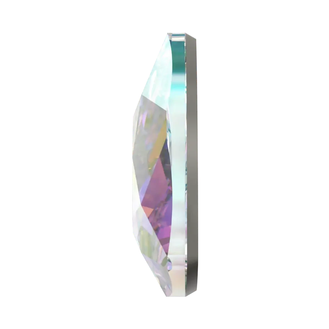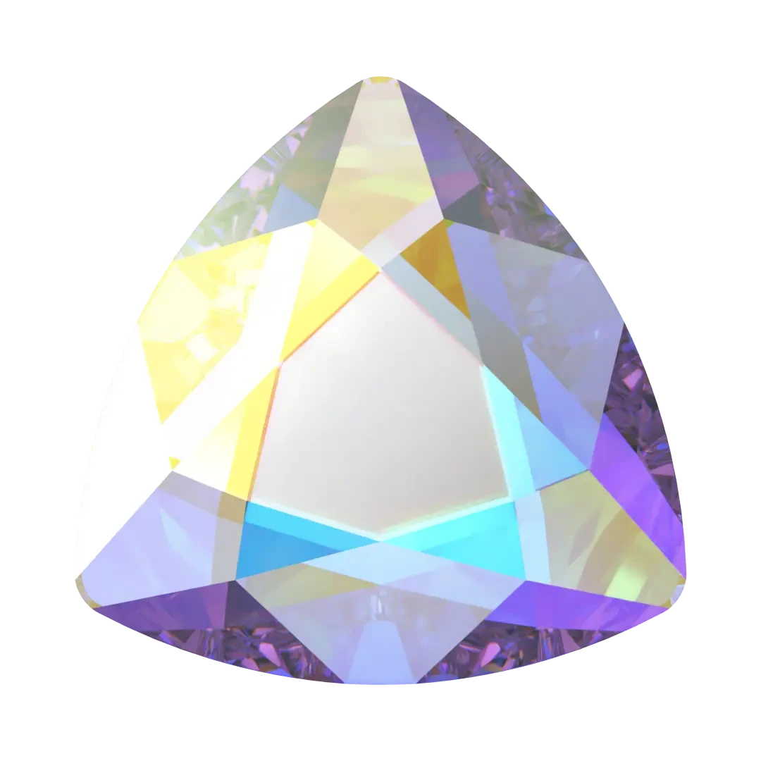 Swarovski rhinestones non hotfix Trilliant (2472) in Crystal AB are flat back crystals that can easily be applied to most surfaces with glue. Swarovski Trilliant shaped crystals are cut into a triangular shape with rounded edges and are known for their striking brilliance and unique faceting. The trilliant shape features a flat top with multiple facets on the sides that reflect light in a beautiful and sparkling way.