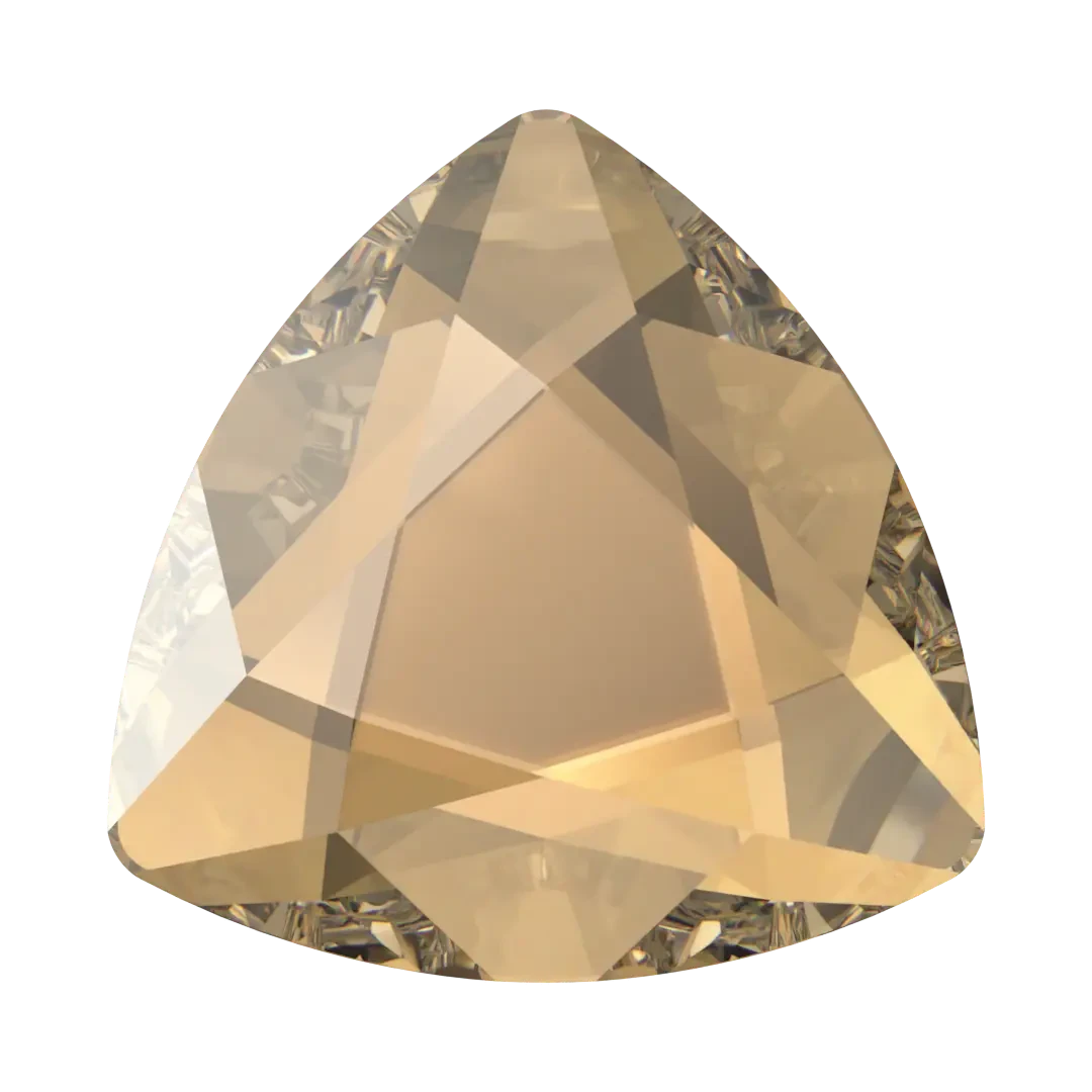 Swarovski rhinestones non hotfix Trilliant (2472) in Crystal Golden Shadow are flat back crystals that can easily be applied to most surfaces with glue. Swarovski Trilliant shaped crystals are cut into a triangular shape with rounded edges and are known for their striking brilliance and unique faceting. The trilliant shape features a flat top with multiple facets on the sides that reflect light in a beautiful and sparkling way.