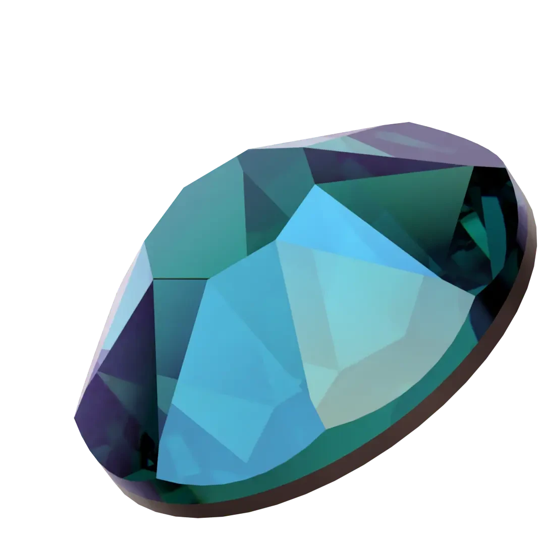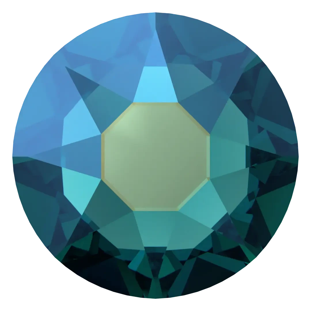 in Blue Zircon Shimmer are flat back crystals where the reverse side of the crystal has been pre-coated with a heat-sensitive glue. Blue Zircon Shimmer is a vibrant and rich shade of blue with a touch of green in its undertones. The colour is reminiscent of the stunning blue waters of the Caribbean and gives off a sense of tranquillity, calmness, and stability. Blue Zircon is often associated with December birthstones and is known for its clarity and brilliance, making it a popular choice for jewellery. Shimmer is a softened version of the Aurora Borealis (AB) effect, giving a more subtle sparkling effect.
