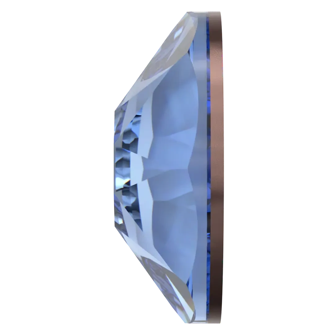 in Light Sapphire are flat back crystals where the reverse side of the crystal has been pre-coated with a heat-sensitive glue. Light Sapphire is a pale shade of blue that resembles the colour of a clear sky on a sunny day. It is a light and delicate shade of blue, that is a popular colour in jewellery, particularly for pairing with colour sapphire and aquamarine.
