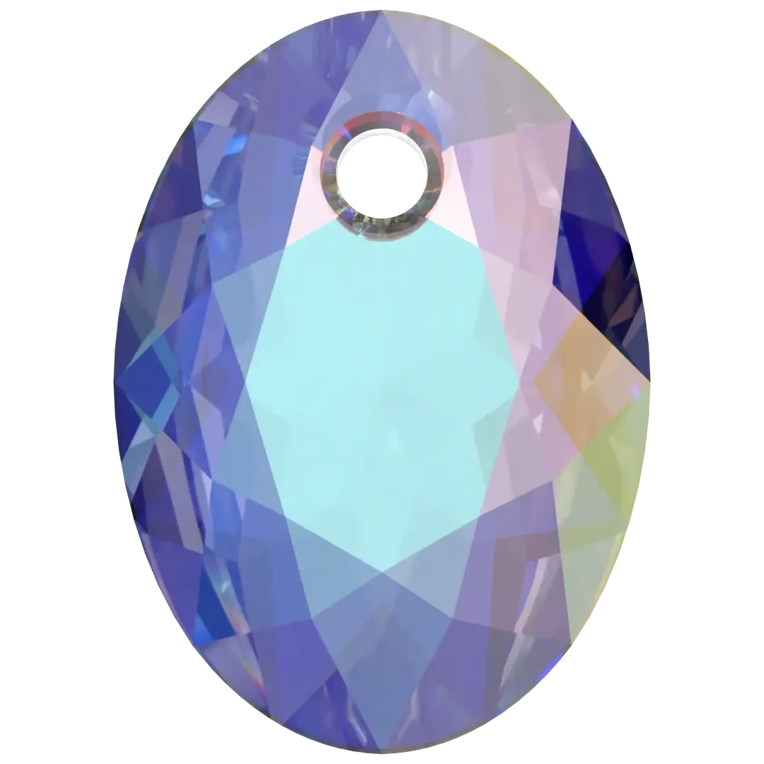 Swarovski pendants Elliptic Cut (6438) in Crystal AB are multi faceted crystals with a thread hole at the top enabling them to be attached to a chain or finding to create a piece of jewellery. Swarovski Elliptic Cut shaped crystal pendants are oval with facets’ on both sides, to create a sparkling, multi-dimensional effect that catches and reflects the light beautifully.