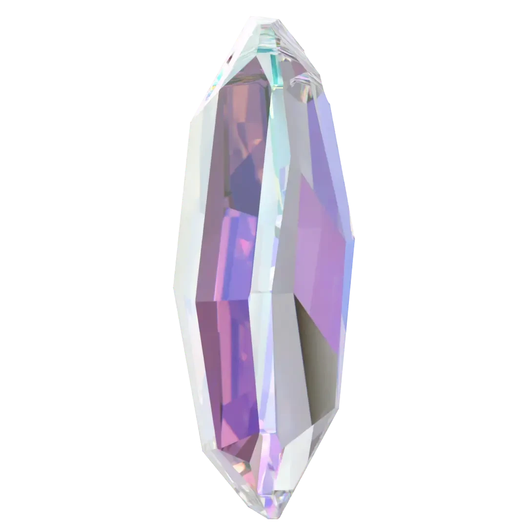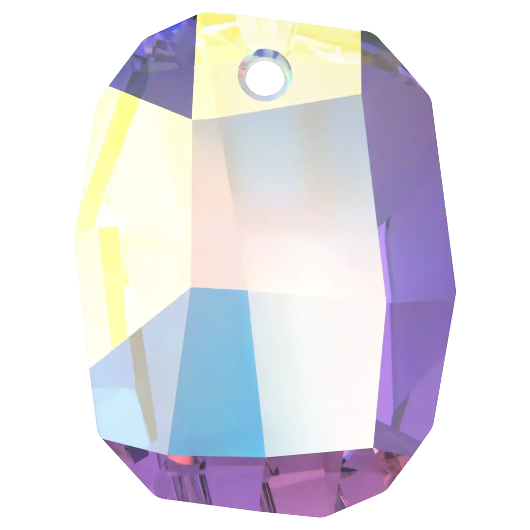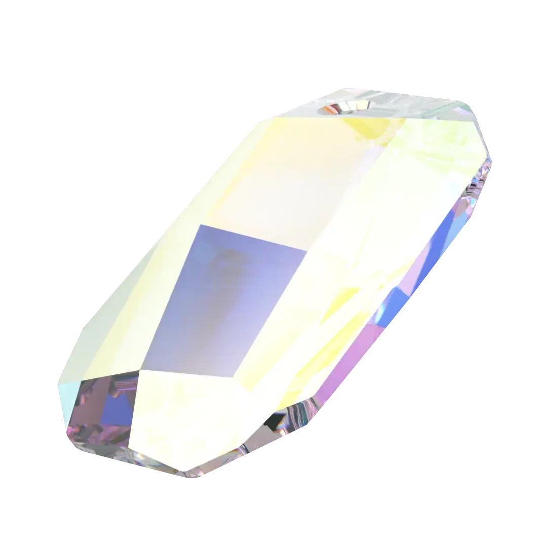 Swarovski pendants Graphic (6685) in Crystal AB are multi faceted crystals with a thread hole at the top enabling them to be attached to a chain or finding to create a piece of jewellery. Swarovski Graphic shaped crystals are rectangular in shape with curved sides, giving a unique and modern design. They feature a geometric shape with a combination of straight lines, curves, and angles that create an intricate pattern on the crystal’s surface.