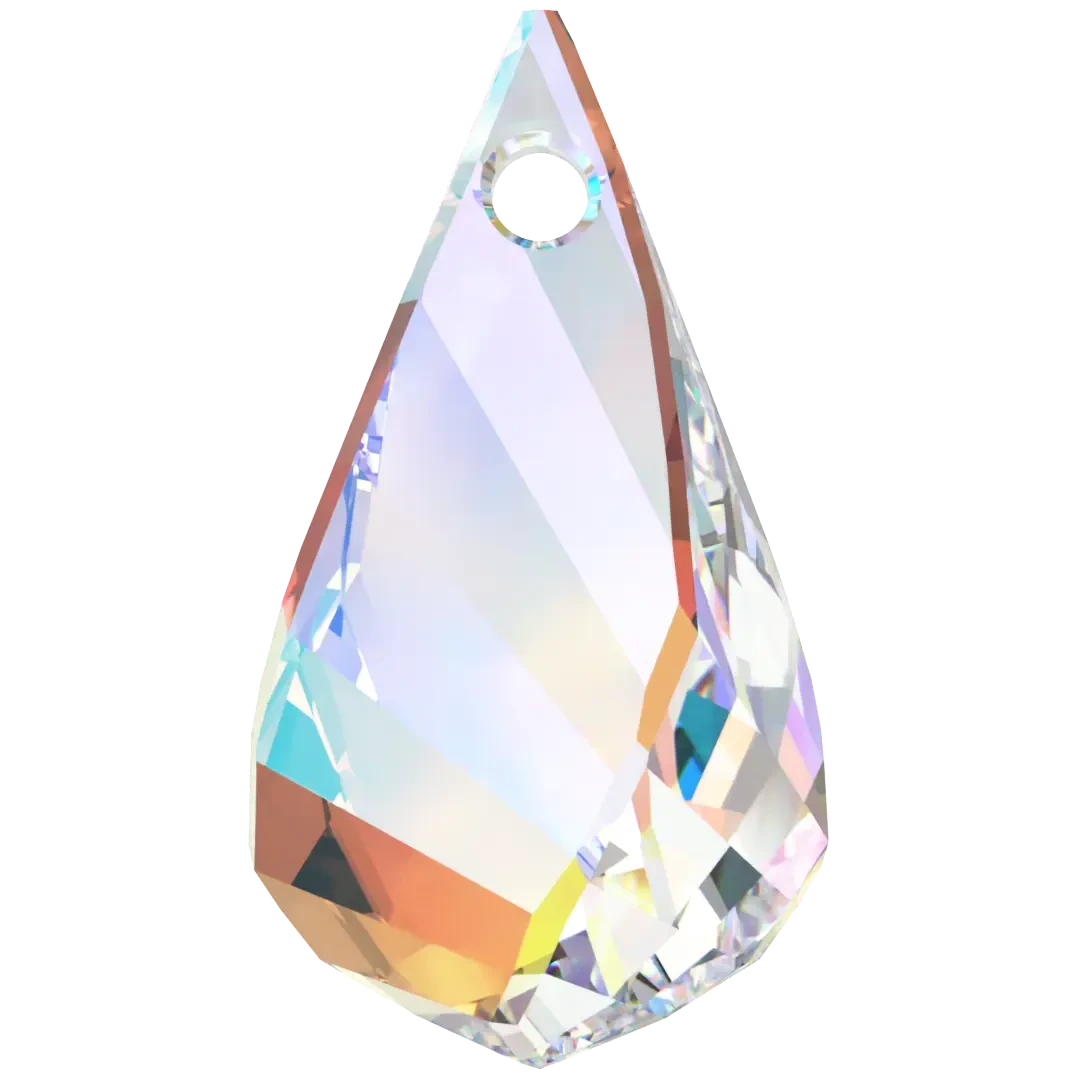 Swarovski pendants Helix (6020) in Crystal AB are multi faceted crystals with a thread hole at the top enabling them to be attached to a chain or finding to create a piece of jewellery. Swarovski Helix shaped crystals showcase an exceptional all-round faceting and a wave-like element that runs from top to bottom, making it an outstanding design element. The strong organic structure of the Helix redefines the boundaries of design, making it a versatile and essential element in jewellery and accessories.