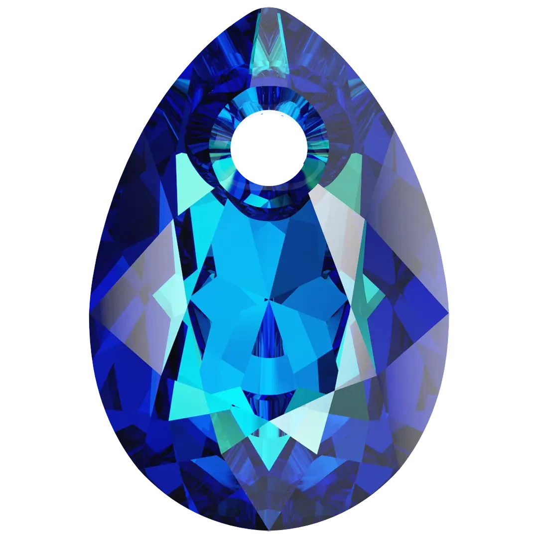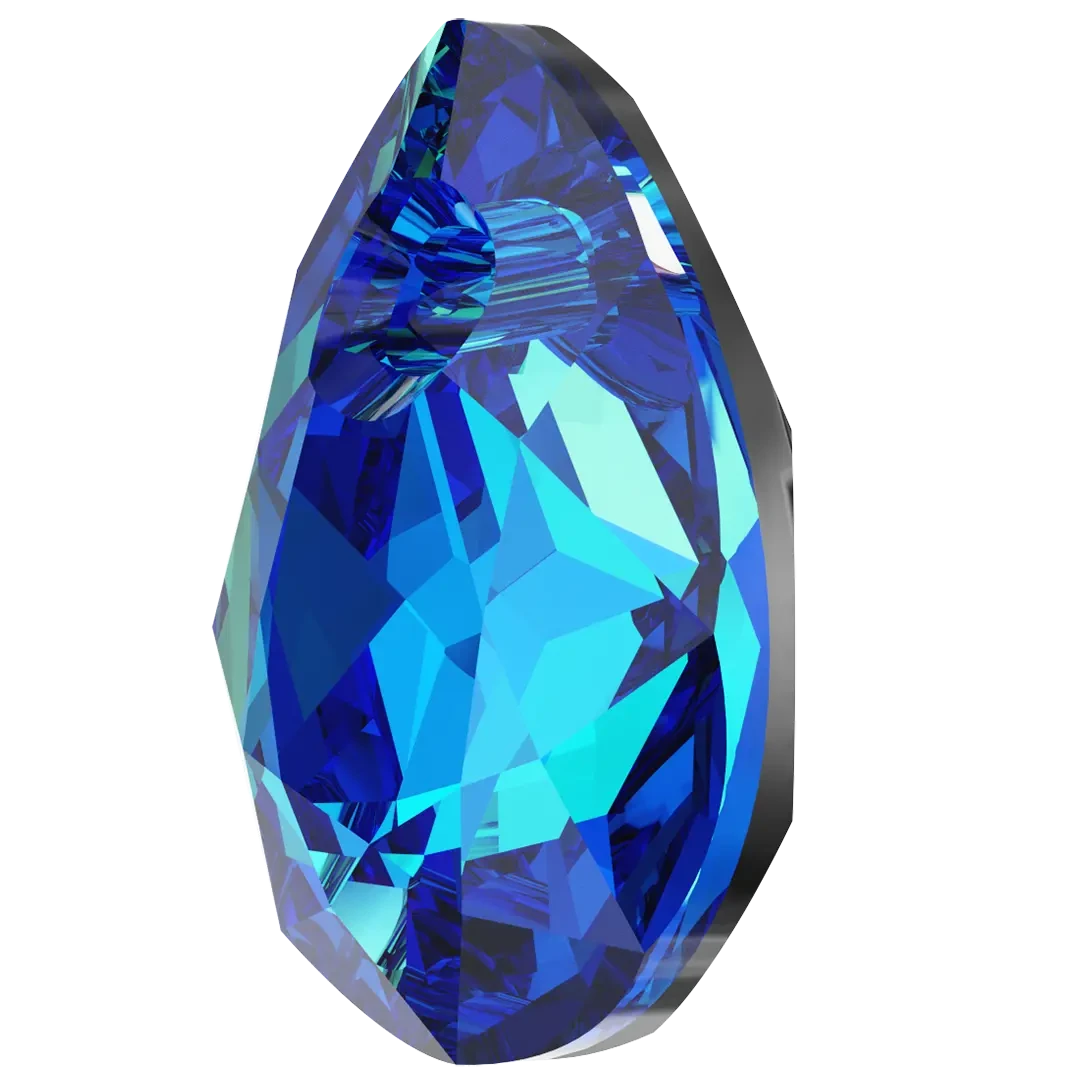 Swarovski pendants Pear Cut (6433) in Crystal Bermuda Blue P are multi faceted crystals with a thread hole at the top enabling them to be attached to a chain or finding to create a piece of jewellery. Swarovski Pear Cut shaped crystals are traditional pear in shape with a rounded bottom and a pointed top. They have a symmetrical shape with a faceted surface that creates a brilliant shine and sparkle.