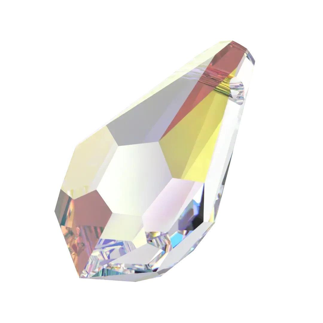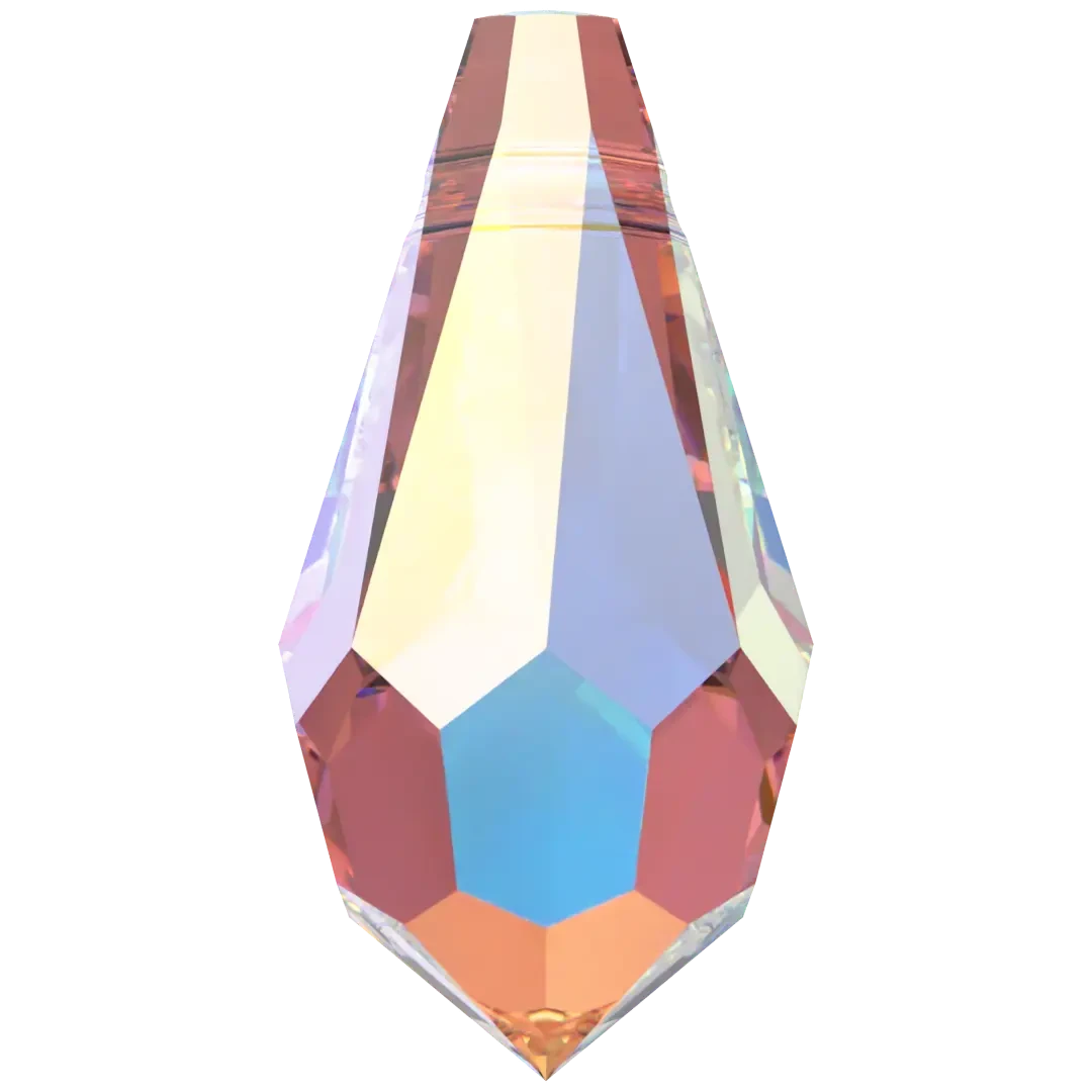 Swarovski pendants Teardrop (6000) in Crystal AB are multi faceted crystals with a thread hole at the top enabling them to be attached to a chain or finding to create a piece of jewellery. Swarovski Teardrop shaped crystals have a distinctive teardrop shape. They have a pointed top and a rounded bottom with facets arranged in a symmetrical pattern, which create a dazzling play of light and reflection.