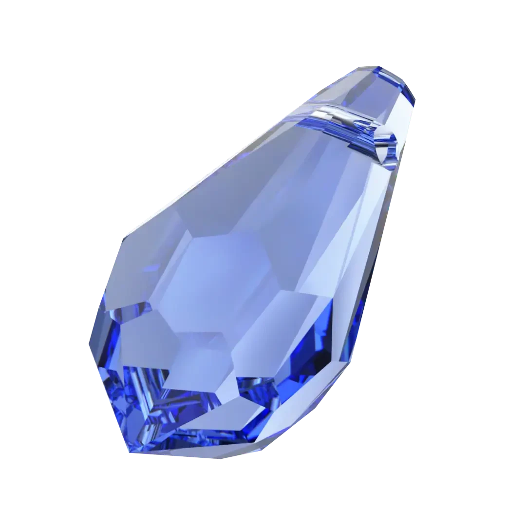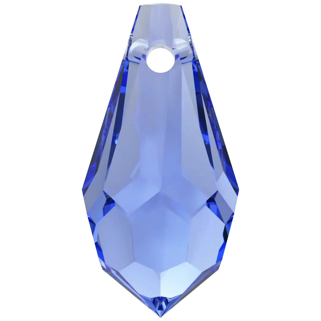 Swarovski pendants Teardrop (6000) in Sapphire are multi faceted crystals with a thread hole at the top enabling them to be attached to a chain or finding to create a piece of jewellery. Swarovski Teardrop shaped crystals have a distinctive teardrop shape. They have a pointed top and a rounded bottom with facets arranged in a symmetrical pattern, which create a dazzling play of light and reflection.