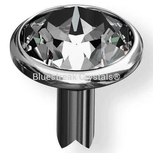 Swarovski Rivets (53005) SS34 in Silver Brushed are chatons that are encased in a metal setting which has a post at the back so that it can be attached to material such as leather or fabrics. The rivet consist of two pieces: the rivet which is a crystal in a metal casing and the back part. The rivet has a small metal post that is inserted into the base material and secures to the back part on the other side of the material. When the rivet is inserted through the base material it connects with the back part, to create a secure attachment.