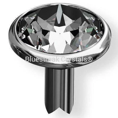 Swarovski Rivets (53006) SS39 in Silver Brushed are chatons that are encased in a metal setting which has a post at the back so that it can be attached to material such as leather or fabrics. The rivet consist of two pieces: the rivet which is a crystal in a metal casing and the back part. The rivet has a small metal post that is inserted into the base material and secures to the back part on the other side of the material. When the rivet is inserted through the base material it connects with the back part, to create a secure attachment.