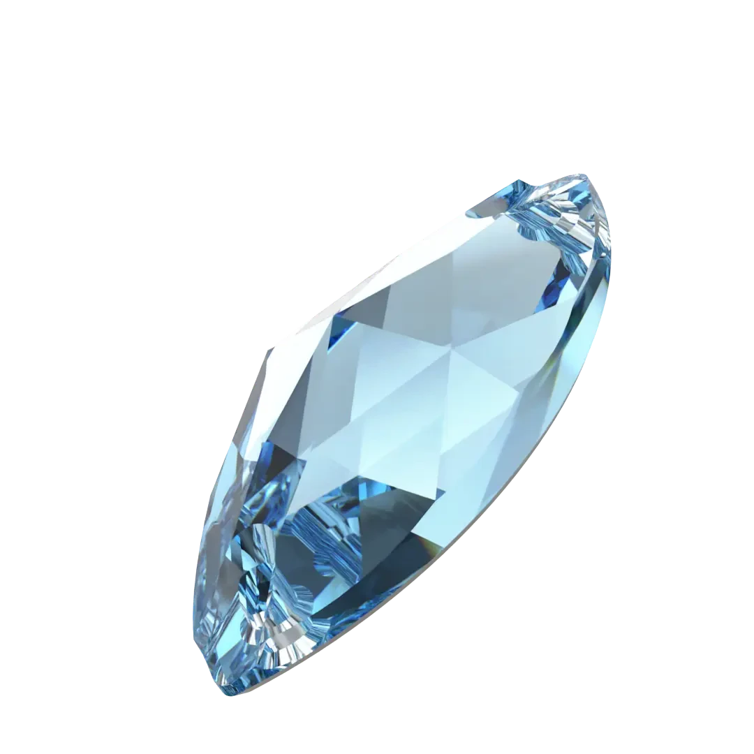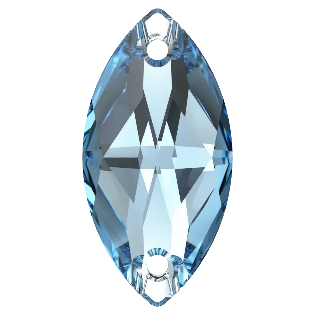 Swarovski sew on crystals Navette (3223) in Aquamarine are loose flat backed crystals that come with a thread hole, enabling the crystals to be sewn onto fabric. Swarovski Navette shaped crystals have an elongated, oval shape with pointed ends that resemble a small canoe or a leaf. They have a flat top surface and bevelled edges that create a multi-faceted effect, giving them a sparkling and radiant appearance.