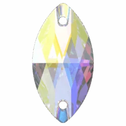 Swarovski sew on crystals Navette (3223) in Crystal AB are loose flat backed crystals that come with a thread hole, enabling the crystals to be sewn onto fabric. Swarovski Navette shaped crystals have an elongated, oval shape with pointed ends that resemble a small canoe or a leaf. They have a flat top surface and bevelled edges that create a multi-faceted effect, giving them a sparkling and radiant appearance.
