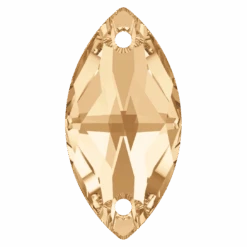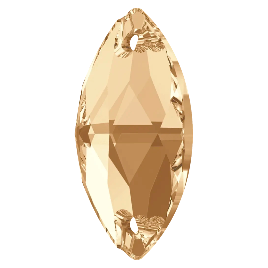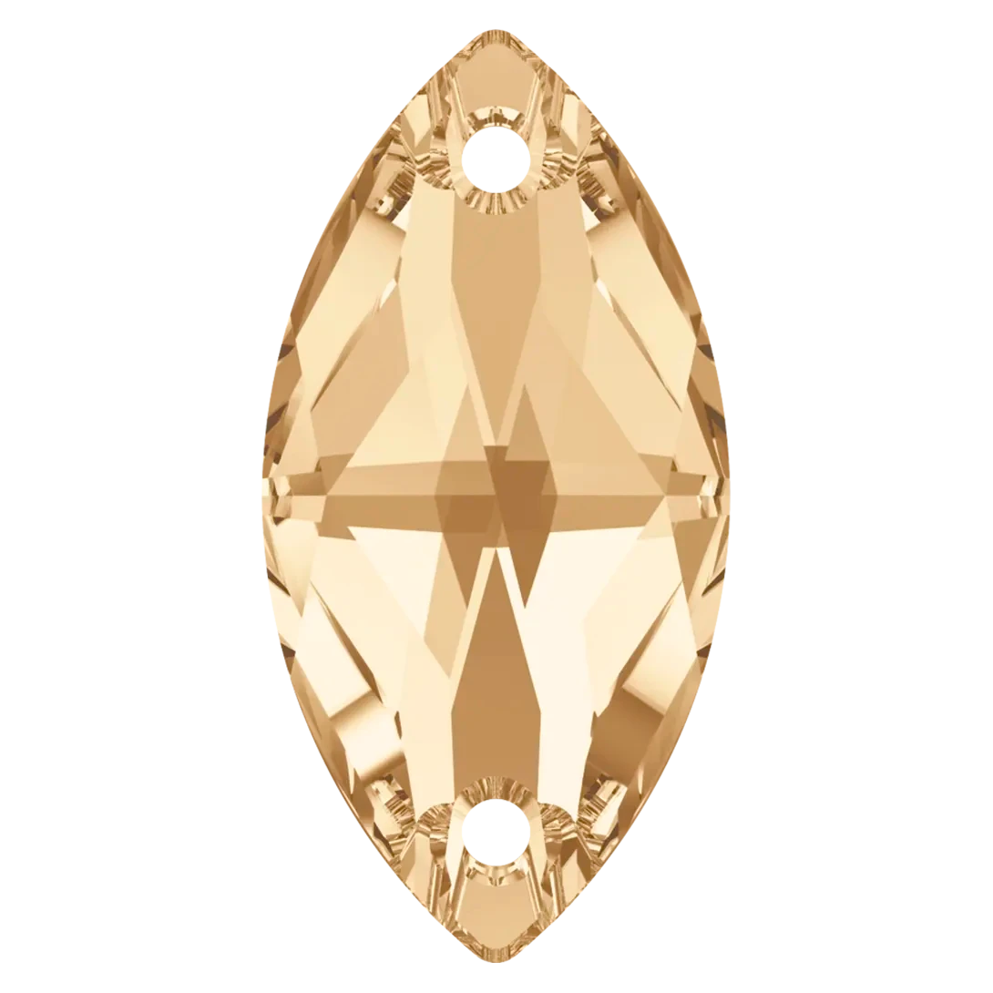 Swarovski sew on crystals Navette (3223) in Crystal Golden Shadow are loose flat backed crystals that come with a thread hole, enabling the crystals to be sewn onto fabric. Swarovski Navette shaped crystals have an elongated, oval shape with pointed ends that resemble a small canoe or a leaf. They have a flat top surface and bevelled edges that create a multi-faceted effect, giving them a sparkling and radiant appearance.