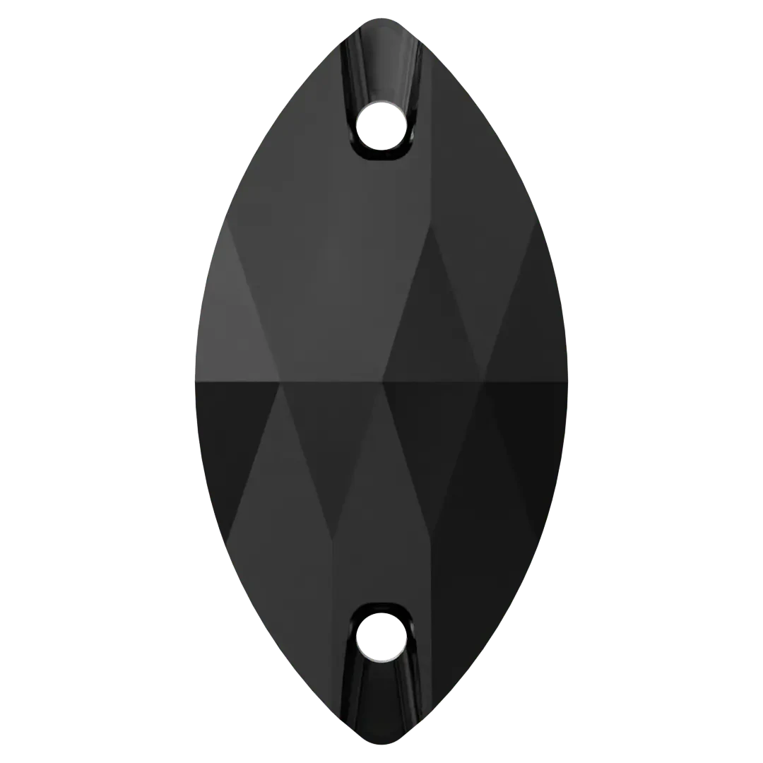 Swarovski sew on crystals Navette (3223) in Jet UNFOILED are loose flat backed crystals that come with a thread hole, enabling the crystals to be sewn onto fabric. Swarovski Navette shaped crystals have an elongated, oval shape with pointed ends that resemble a small canoe or a leaf. They have a flat top surface and bevelled edges that create a multi-faceted effect, giving them a sparkling and radiant appearance.