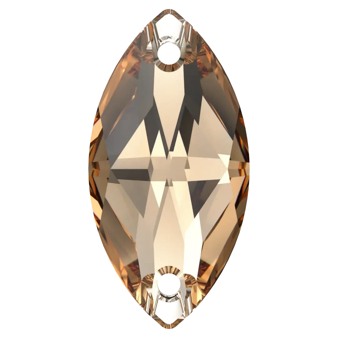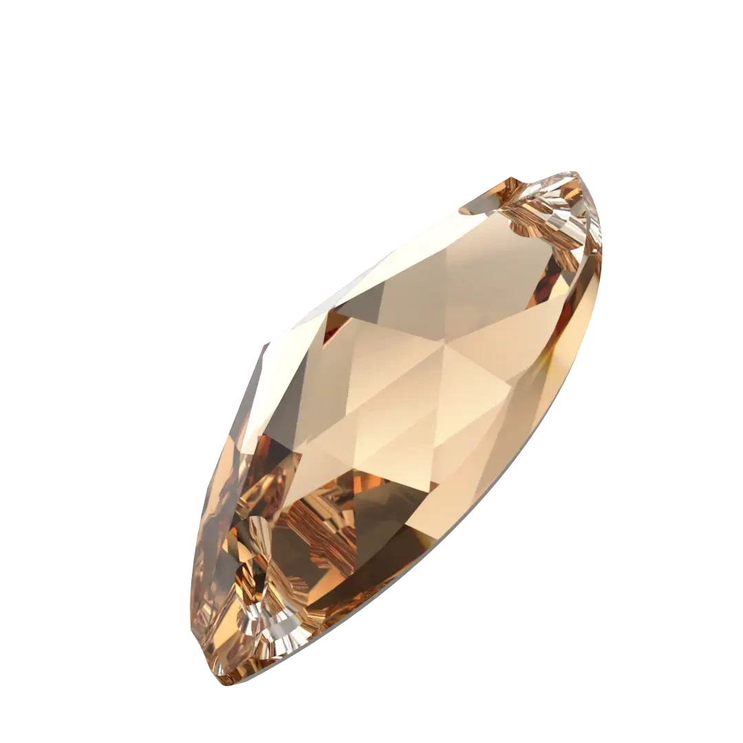 Swarovski sew on crystals Navette (3223) in Light Colorado Topaz are loose flat backed crystals that come with a thread hole, enabling the crystals to be sewn onto fabric. Swarovski Navette shaped crystals have an elongated, oval shape with pointed ends that resemble a small canoe or a leaf. They have a flat top surface and bevelled edges that create a multi-faceted effect, giving them a sparkling and radiant appearance.