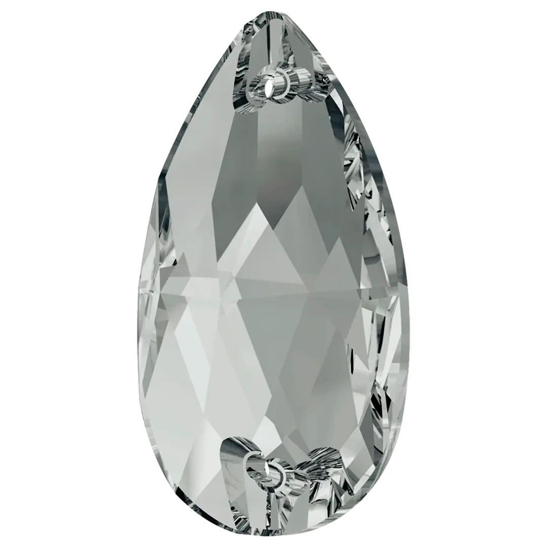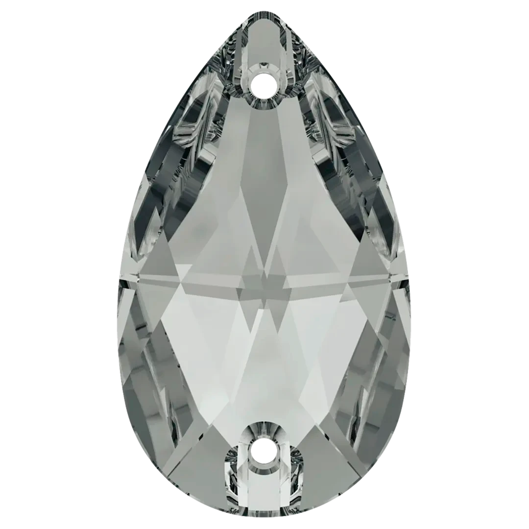 Swarovski sew on crystals Peardrop (3230) in Crystal Silver Night UNFOILED are loose flat backed crystals that come with a thread hole, enabling the crystals to be sewn onto fabric. Swarovski Peardrop shaped crystals have a distinctive teardrop shape. They are smaller at the top and wider at the bottom, resembling a droplet of water or a teardrop.