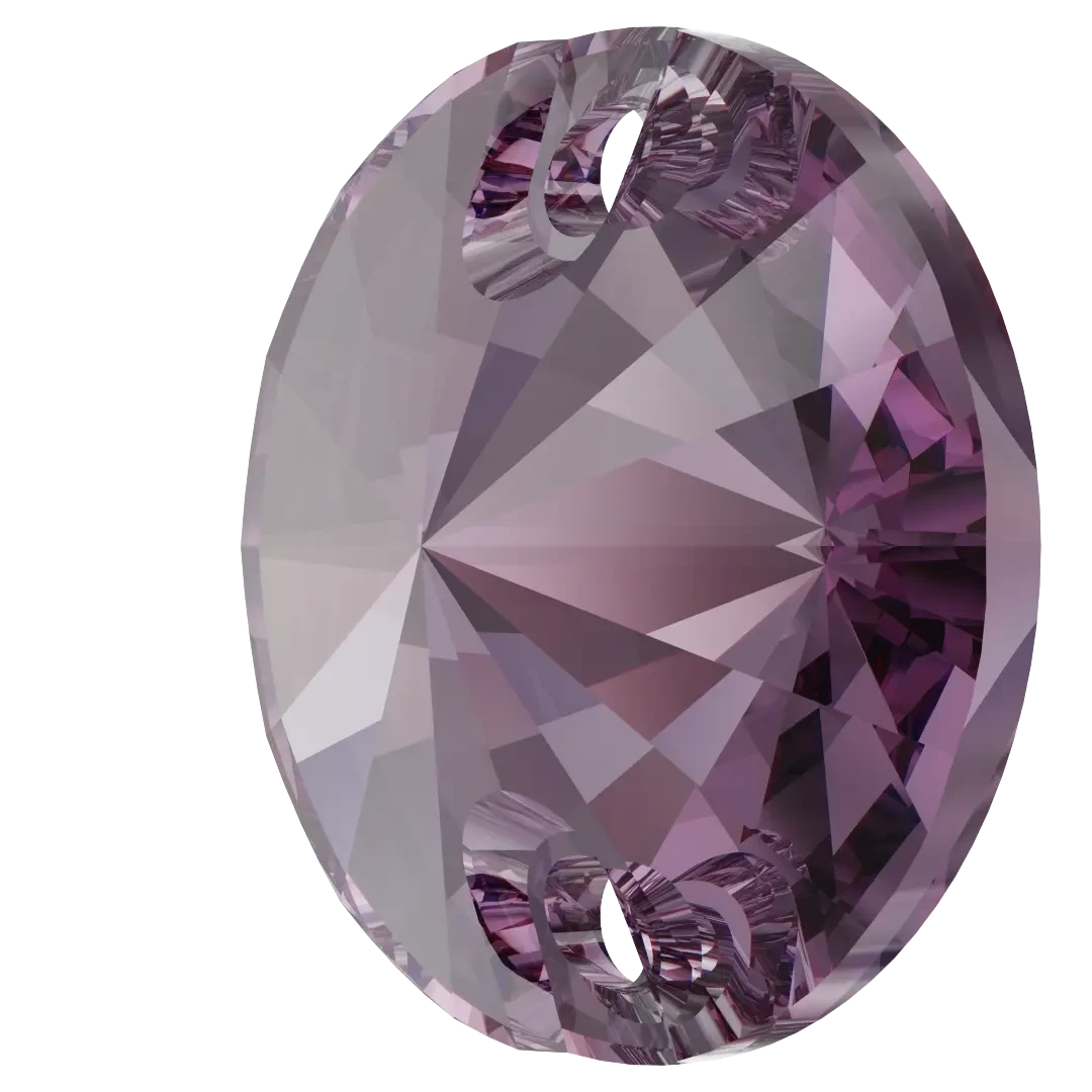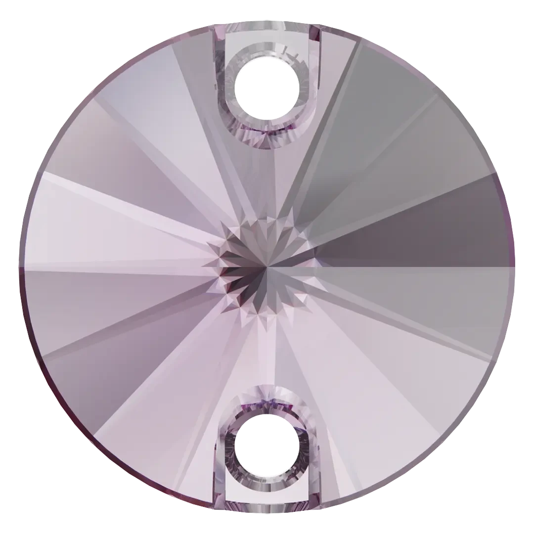 Swarovski sew on crystals Rivoli (3200) in Iris are loose flat backed crystals that come with a thread hole, enabling the crystals to be sewn onto fabric. Swarovski Rivoli shaped crystals are cut glass crystals that have specifically cut facets which lead to a point. They are foiled on the underside of the crystal to reflect the light and enhance the colour of the stone.