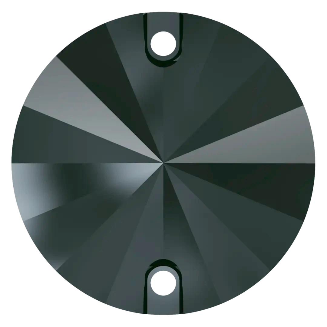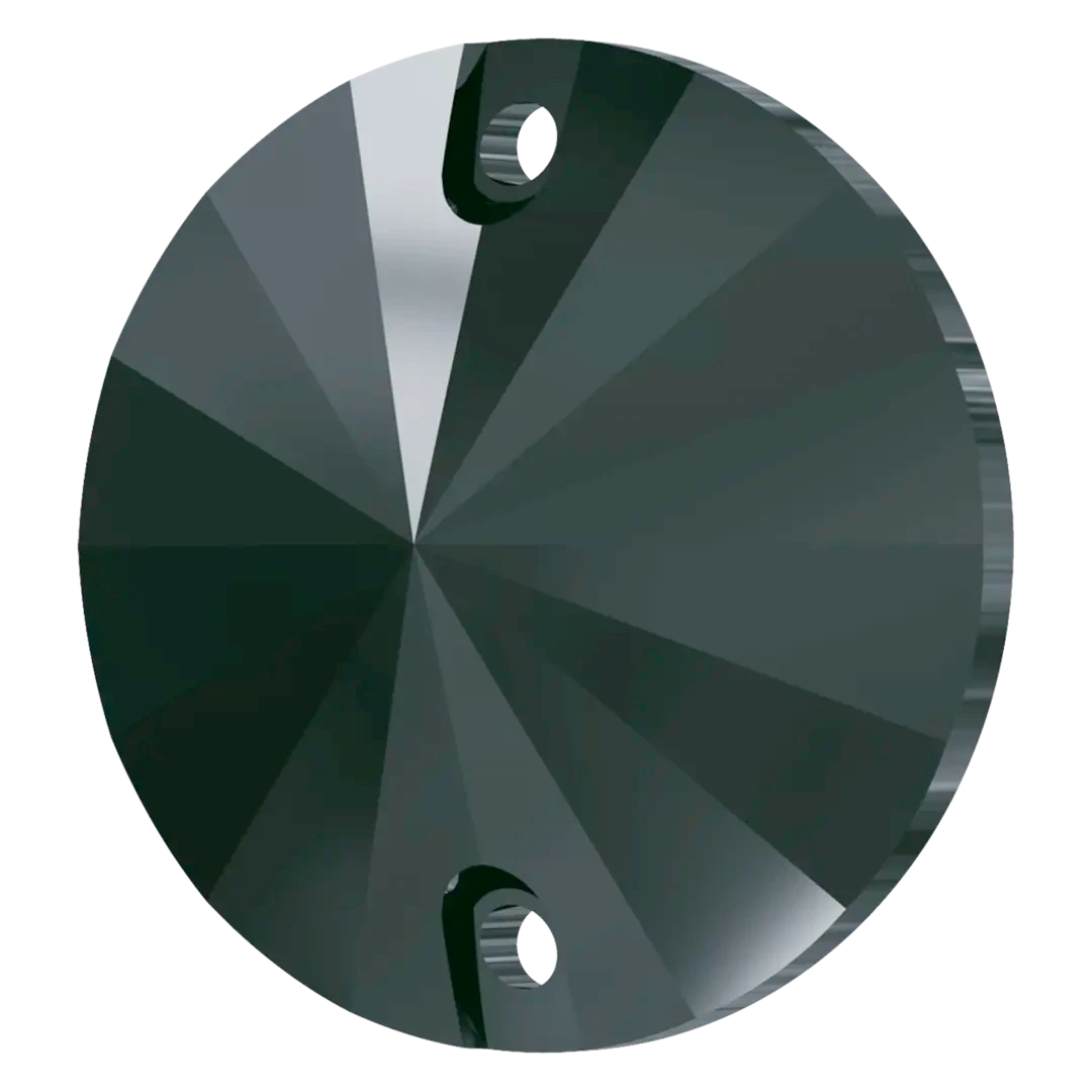 Swarovski sew on crystals Rivoli (3200) in Jet Hematite UNFOILED are loose flat backed crystals that come with a thread hole, enabling the crystals to be sewn onto fabric. Swarovski Rivoli shaped crystals are cut glass crystals that have specifically cut facets which lead to a point. They are foiled on the underside of the crystal to reflect the light and enhance the colour of the stone.