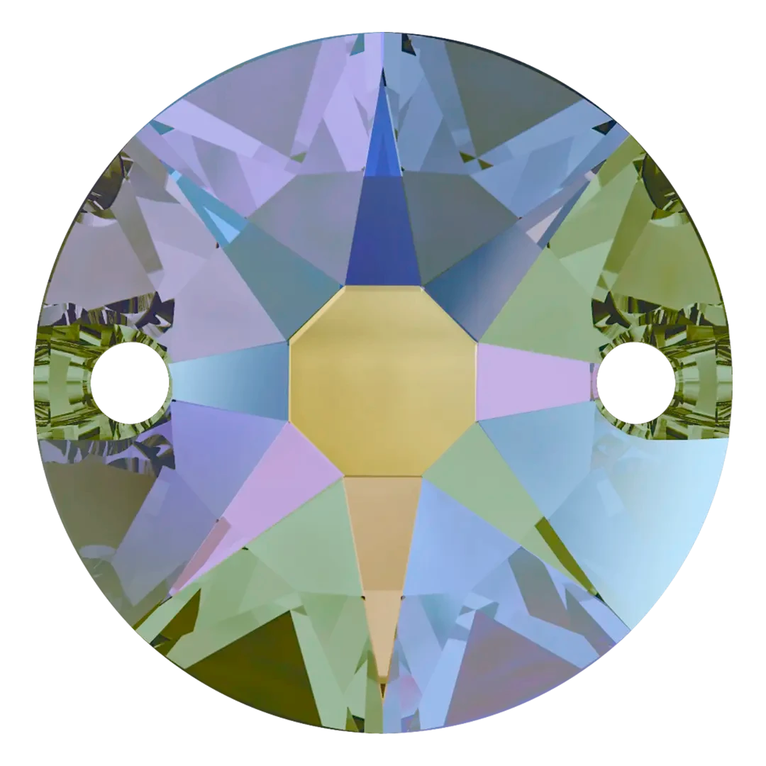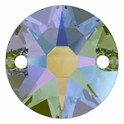 Swarovski sew on crystals Xirius (3288) in Crystal Paradise Shine are loose flat backed crystals that come with a thread hole, enabling the crystals to be sewn onto fabric. Swarovski Xirius sew on stones have a patented cut that features a star shape with 16 facets on the top and 8 facets on the bottom, creating a complex and brilliant surface. Designed to maximize the number of facets on the surface of the crystal, the cut allows for increased light refraction and sparkle.