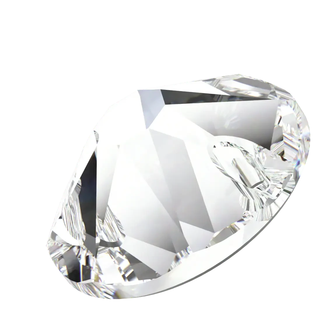 Swarovski sew on crystals Xirius (3288) in Crystal are loose flat backed crystals that come with a thread hole, enabling the crystals to be sewn onto fabric. Swarovski Xirius sew on stones have a patented cut that features a star shape with 16 facets on the top and 8 facets on the bottom, creating a complex and brilliant surface. Designed to maximize the number of facets on the surface of the crystal, the cut allows for increased light refraction and sparkle.