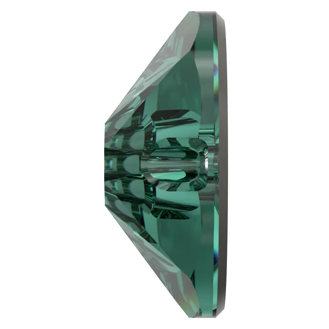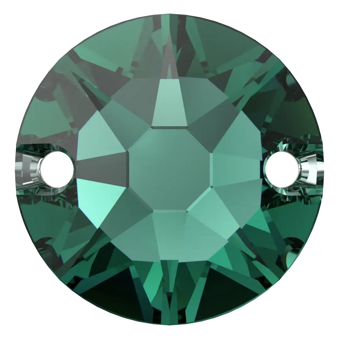 Swarovski sew on crystals Xirius (3288) in Emerald are loose flat backed crystals that come with a thread hole, enabling the crystals to be sewn onto fabric. Swarovski Xirius sew on stones have a patented cut that features a star shape with 16 facets on the top and 8 facets on the bottom, creating a complex and brilliant surface. Designed to maximize the number of facets on the surface of the crystal, the cut allows for increased light refraction and sparkle.